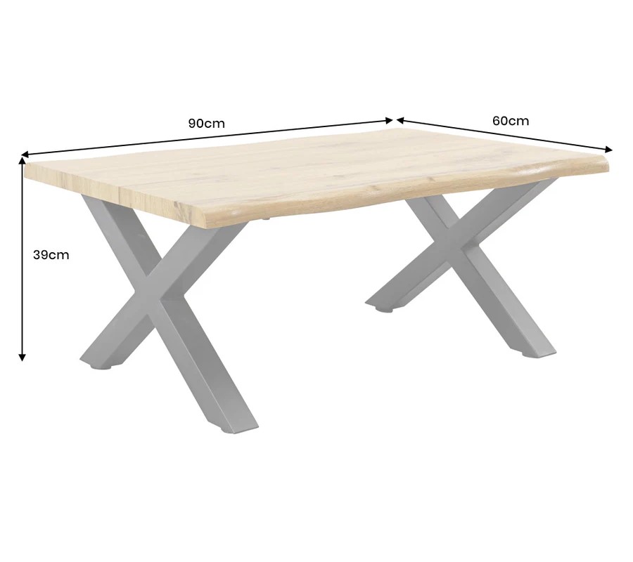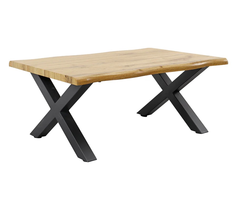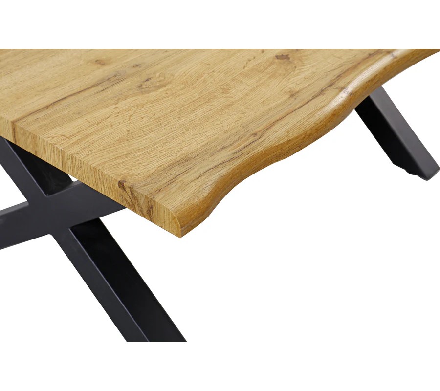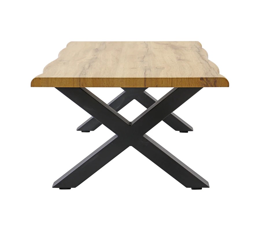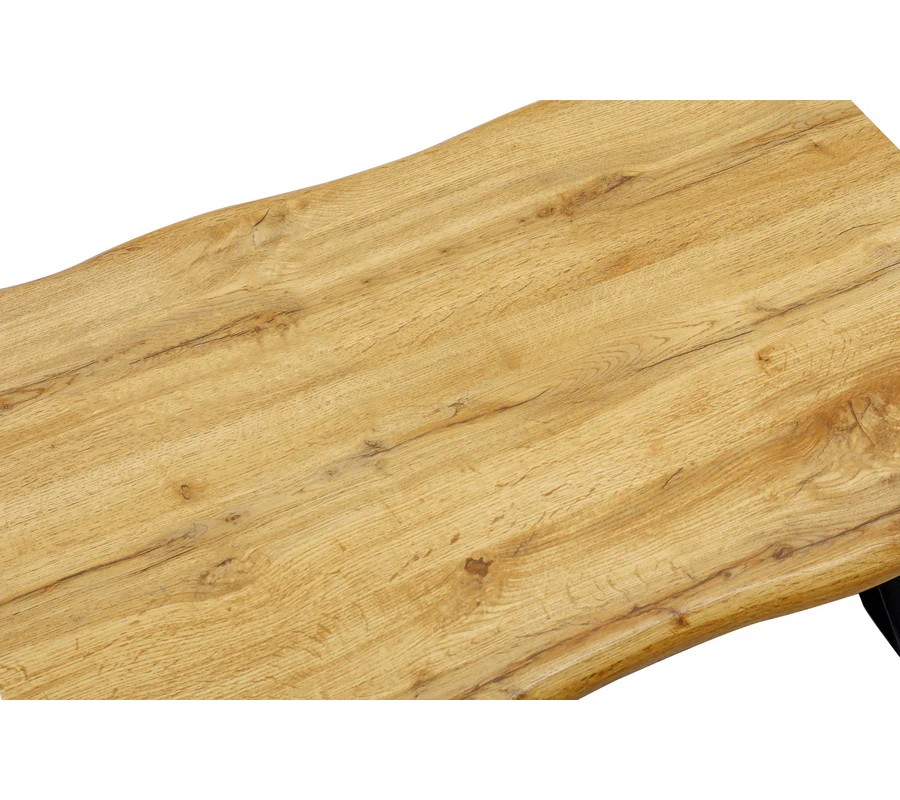 Konferenčný stolík má obdĺžnikovú dosku z dyhovaného dreva v dubovom prevedení, ktorá zaujme svojou prirodzenou textúrou a jemne nepravidelnými okrajmi, pripomínajúcimi autentický vzhľad prírodného dreva. Povrch dosky je hladký, s jemným matným lakovaním, ktoré chráni drevo a zároveň zvýrazňuje jeho jedinečný charakter.