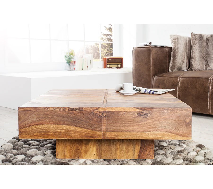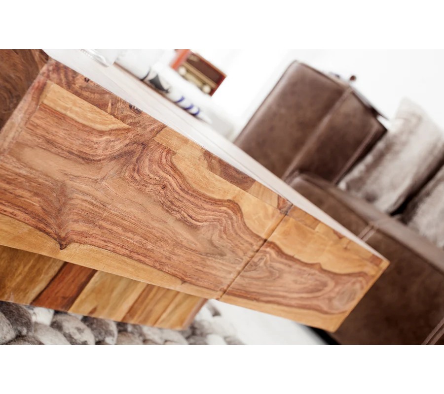 Konferenčný stolík Bolt štvorcového tvaru je vyrobený z masívneho sheeshamového dreva, ktoré je známe svojou odolnosťou a výraznou kresbou. Sheesham je druh palisandru a je vyhľadávaný pre svoju výraznú kresbu. Povrch stolíka je hladko opracovaný, s jemným leskom, ktorý zvýrazňuje prirodzené tóny dreva v odtieňoch medovej hnedej s tmavšími vzormi, čím každý kus získava jedinečný charakter.