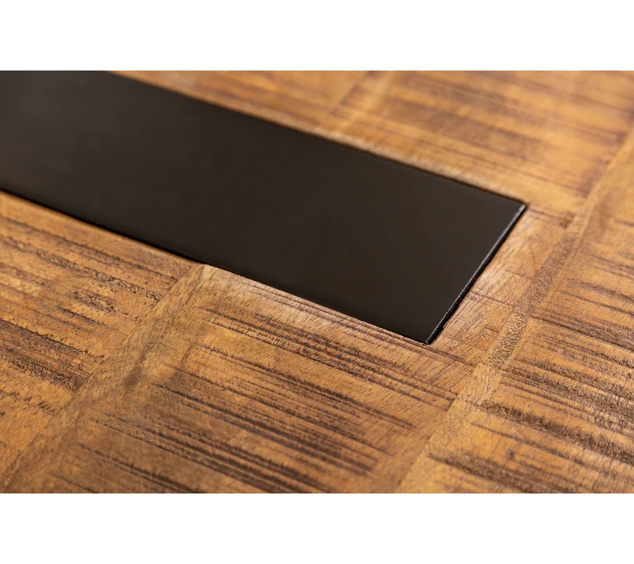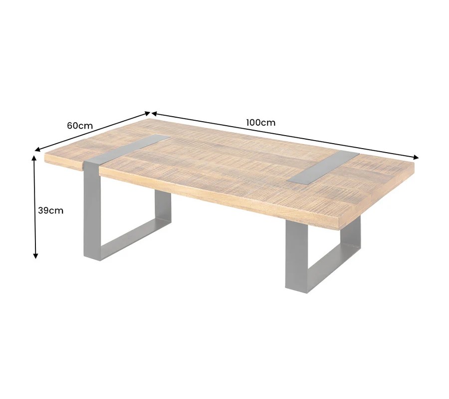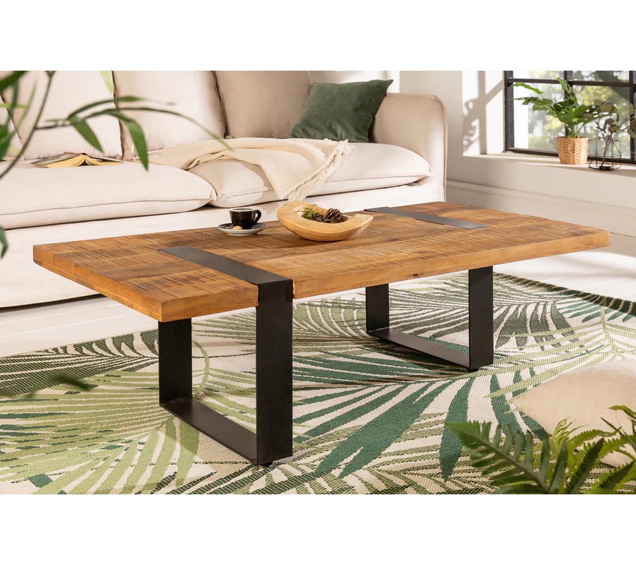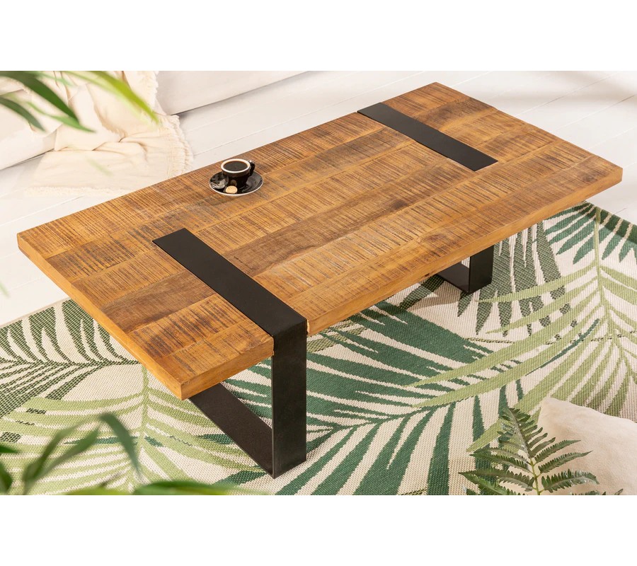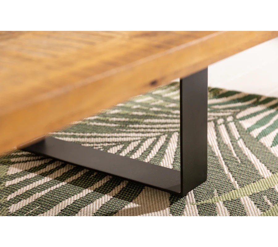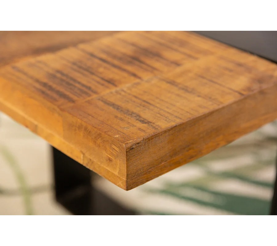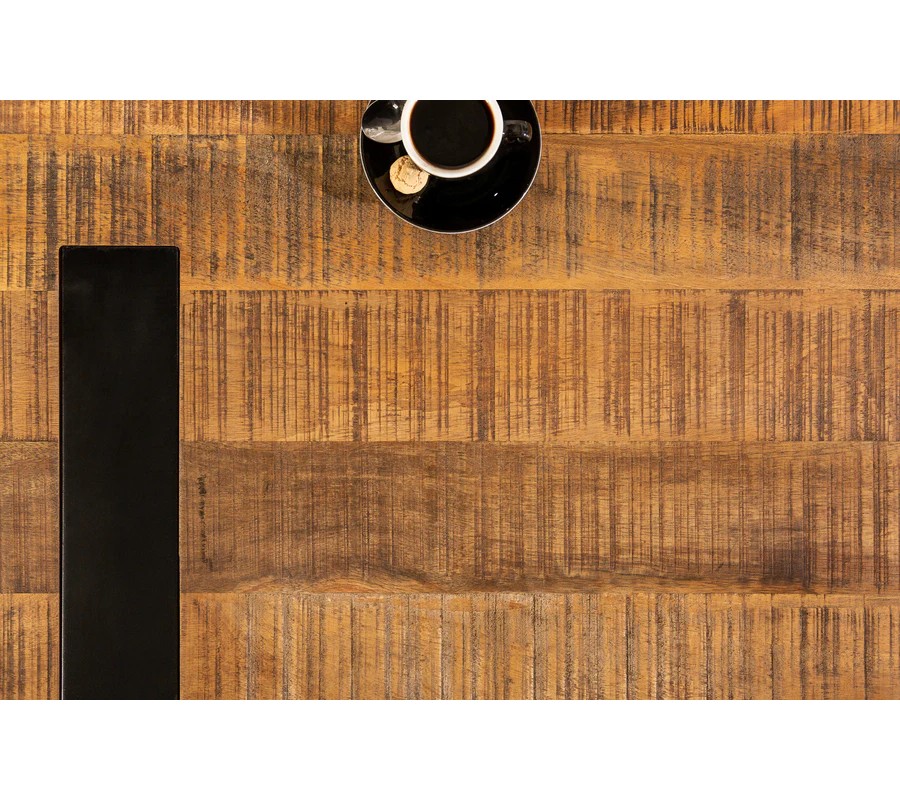 Konferenčný stolík Steele Craft má jednoduchý obdĺžnikový tvar, ktorý pôsobí robustne a zároveň moderným dojmom. Vrchná doska je vyrobená z masívneho mangového dreva s výraznou prírodnou textúrou a teplým hnedým odtieňom. Povrch je hladký, no zachováva si autentický rustikálny vzhľad s kovovými detailmi nožičiek, ktorých vrchná hrana lícuje s doskou. Doska sa skladá s niekoľko lakovaných dosiek. Čierne kovové nohy v tvare obráteného U pridávajú stolíku industriálny charakter a zabezpečujú stabilitu.