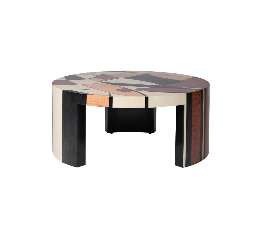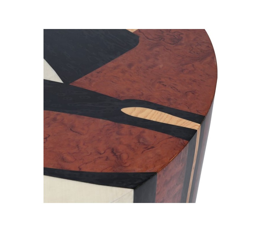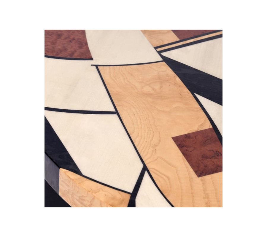 Konferenčný stolík Jacobi má okrúhly tvar a jeho povrch je zdobený výraznými geometrickými vzormi v rôznych odtieňoch. Farebnosť zahŕňa tóny čiernej, bielej, krémovej, hnedej a medovej, ktoré sú usporiadané v asymetrickom štýle, pripomínajúcom moderné umelecké maľby alebo kubistické kompozície.