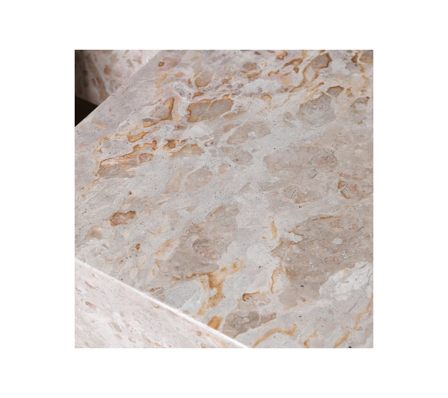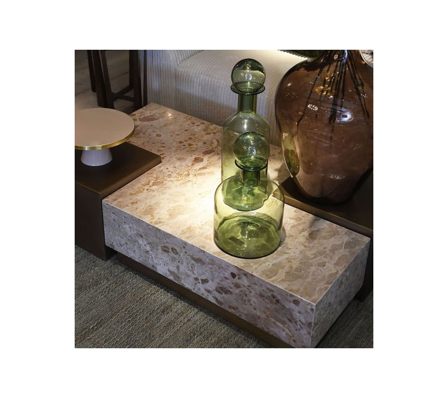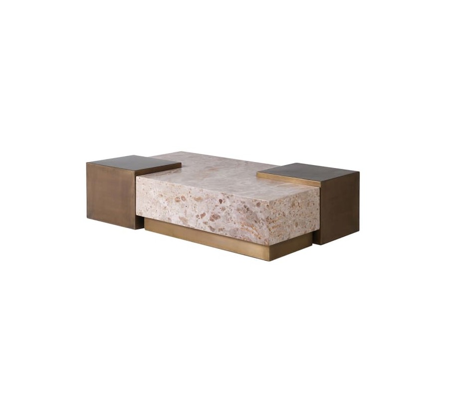 Na rohoch stolíka sú umiestnené dva modulárne štvorcové stolíky. Rovnako ako podstava na mramorovej časti, sú vyrobené z kovu s povrchovou úpravou v zlatej farbe s jemnou patinou, ktorá dodáva nábytku štýlový vintage nádych.