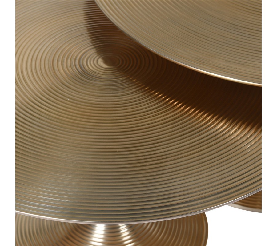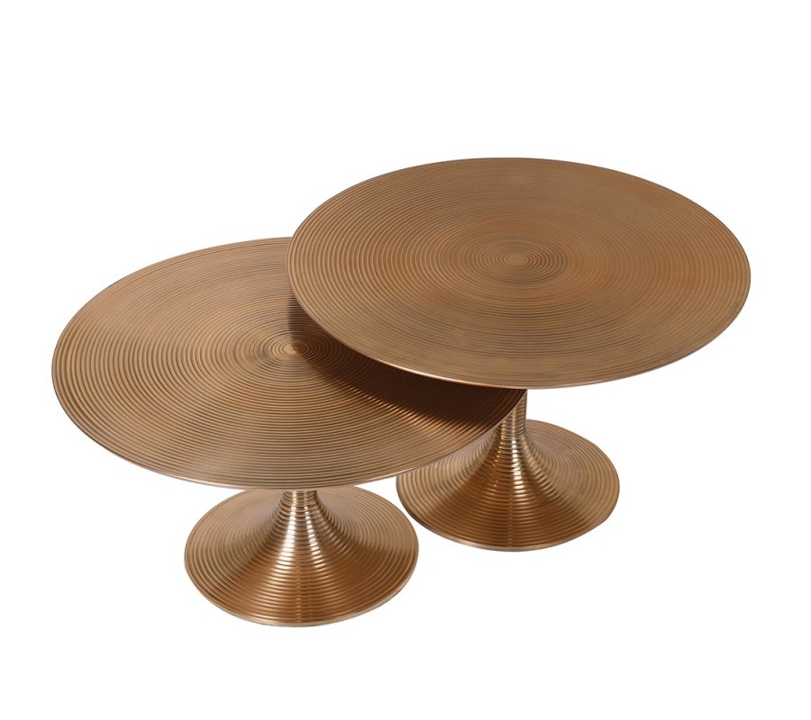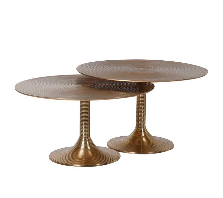 Konferenčné stolíky Zarina majú okrúhlu dosku a jednu centrálnu nohu, ktorá sa smerom dole rozširuje do okrúhleho podstavca v tvare kalicha. Celkový vzhľad pôsobí elegantne a luxusne, a to vďaka zlatisto mosadznej povrchovej úprave kovu. Všimnúť si možno jemnú kruhovú štruktúru vyrytú do povrchu nôh aj vrchnej dosky, sú to sústredné kružnice, ktoré stolíkom pridávajú zaujímavý 3D efekt. Výška vyššieho stolíka je 47 cm a nižšieho 41 cm.