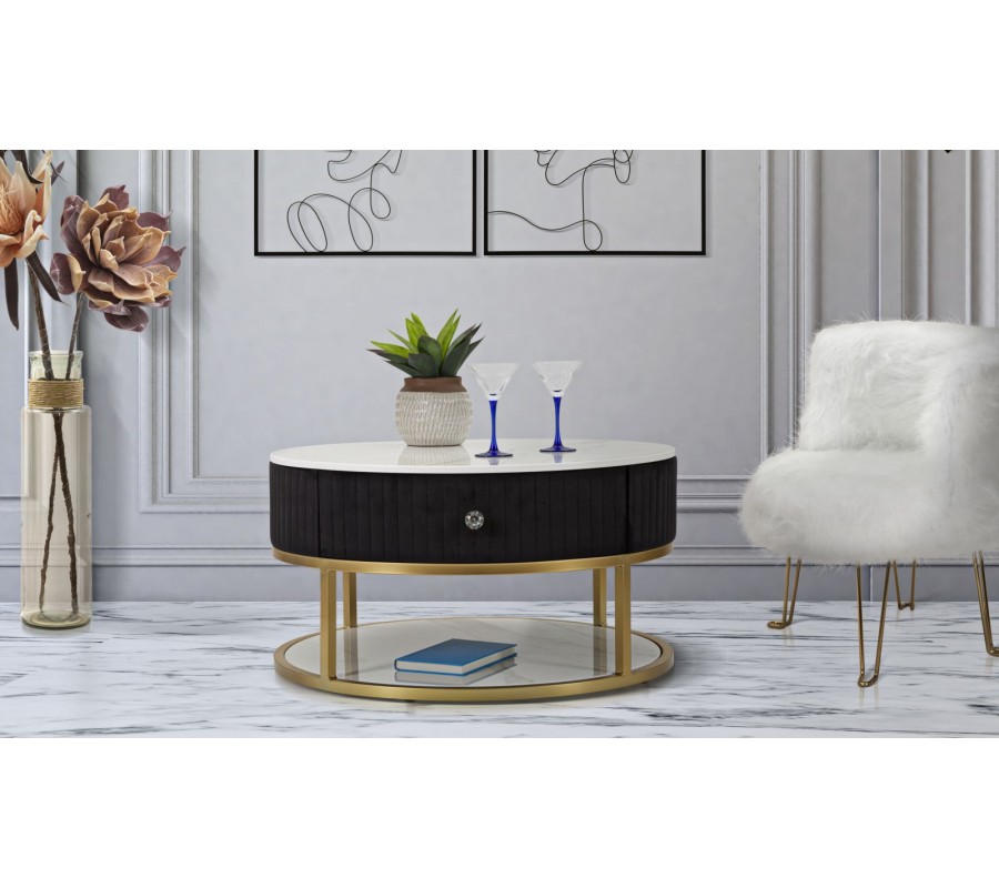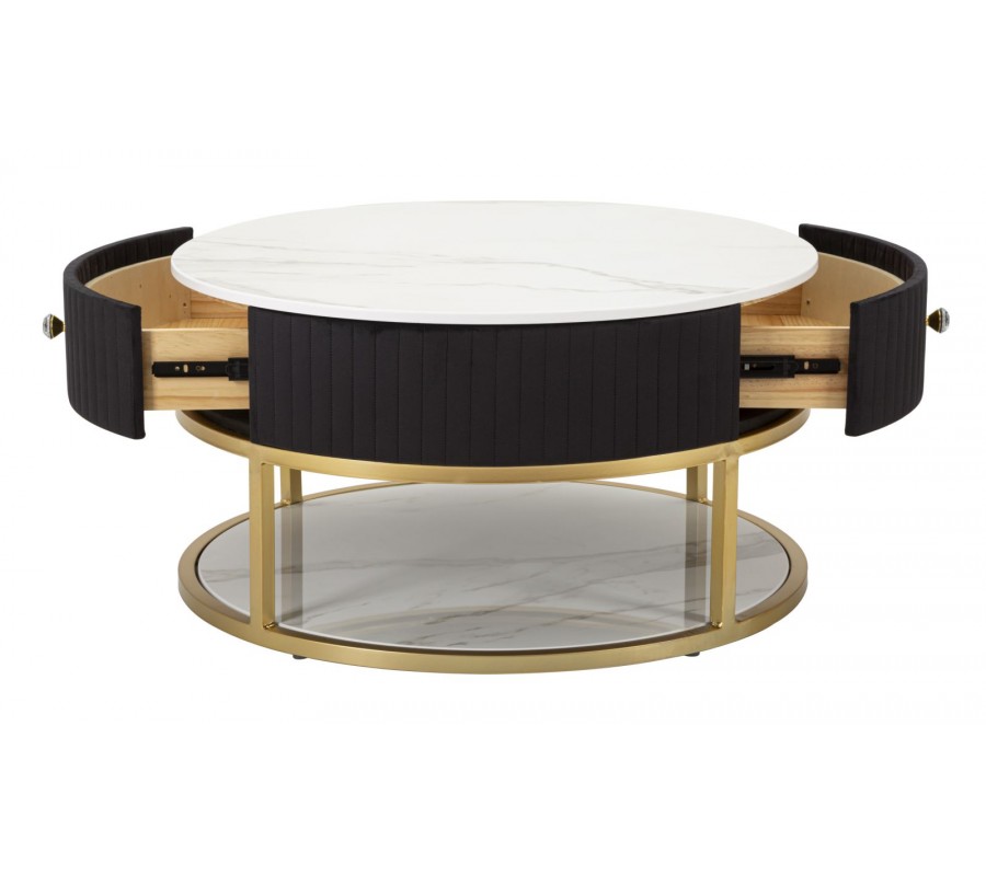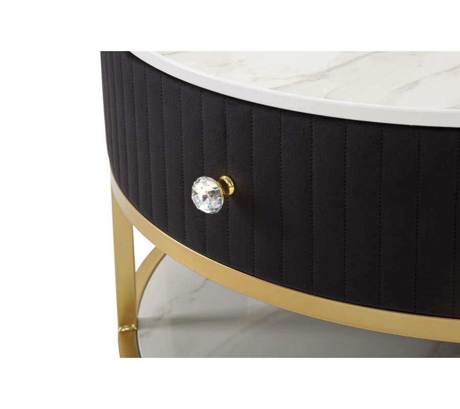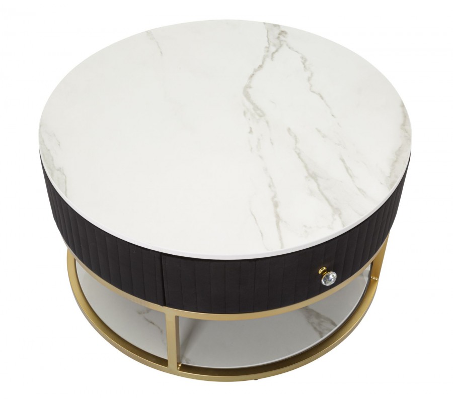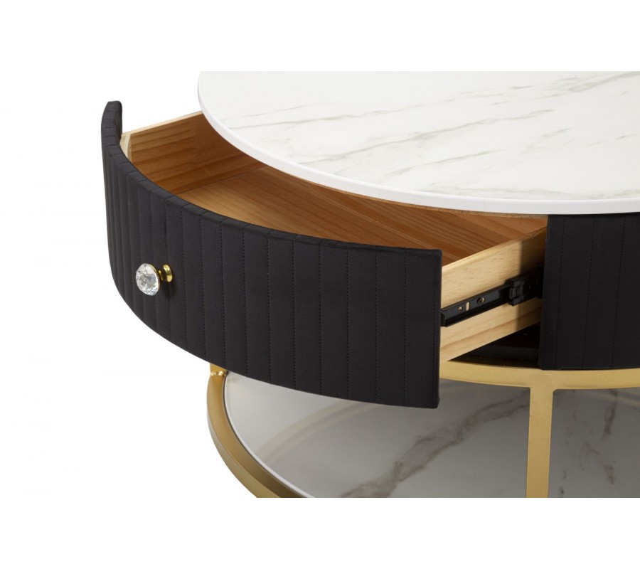 Art deco čierny okrúhly konferenčný stolík Glamia Tapisé s dvomi zásuvkami a zlatou konštrukciou a s bielou doskou 75 cm