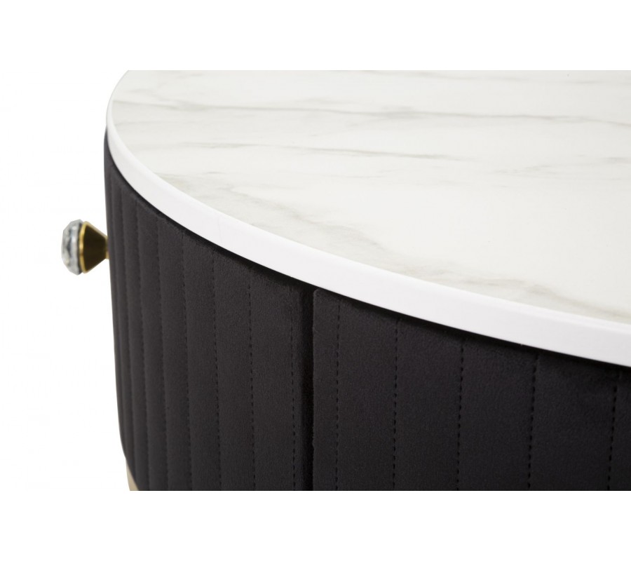 Konferenčný stolík Glamia Tapisé má okrúhly tvar a na prvý pohľad zaujme prepychovým vzhľadom. Korpus je potiahnutý zamatovou látkou v čiernej farbe, pričom zvislé prešívanie vytvára elegantný prúžkovaný efekt. Nachádzajú sa tu dve zásuvky, ktoré otvárate pomocou výraznej kryštálovej úchytky, zdôrazňujúcej glamour a art deco charakter stolíka.