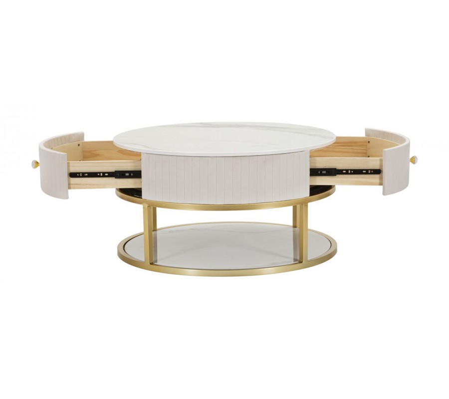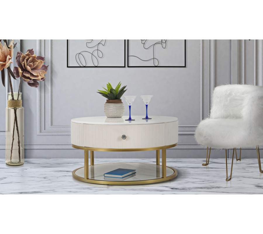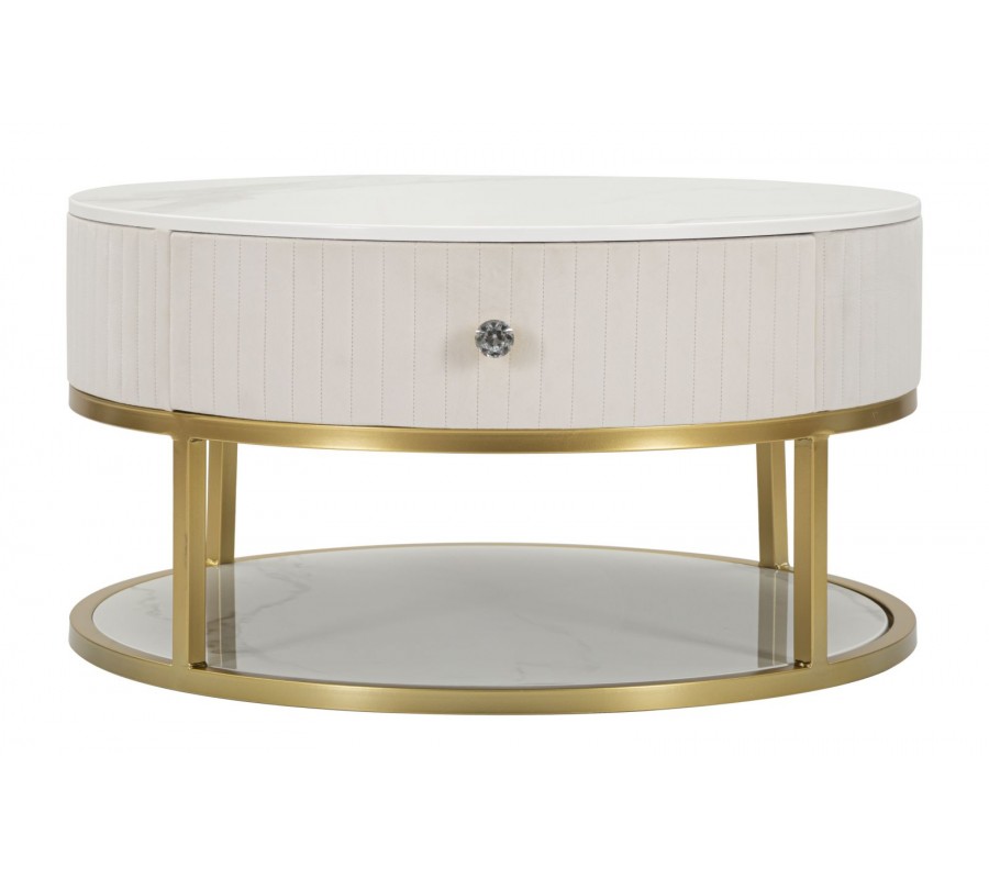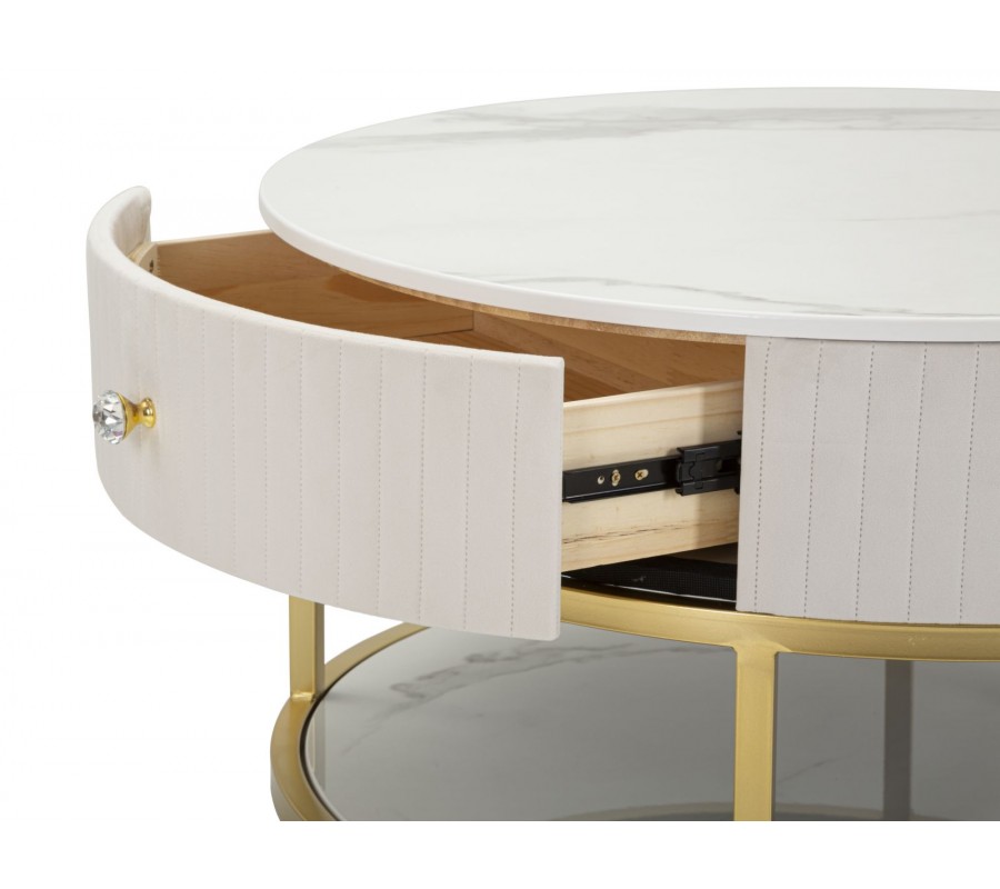 Art deco okrúhly krémový konferenčný stolík Glamia Tapisé s dvomi zásuvkami a so zlatou konštrukciou s bielou doskou 75 cm