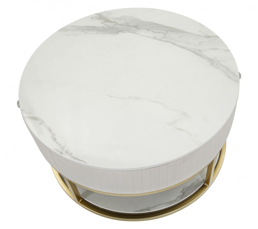 Vrchná doska je z dreva s dizajnom bieleho mramoru, čo spoločne s kovovým, zlatým rámom podčiarkuje art deco a glamour charakter stolíka. V spodnej časti nájdete okrúhlu policu vo forme lesklého povrchu, ktorú lemuje rovnaká zlatá obruba ako pri hornej doske.