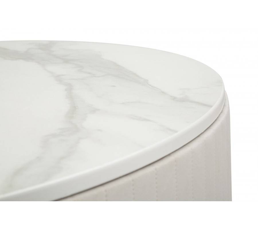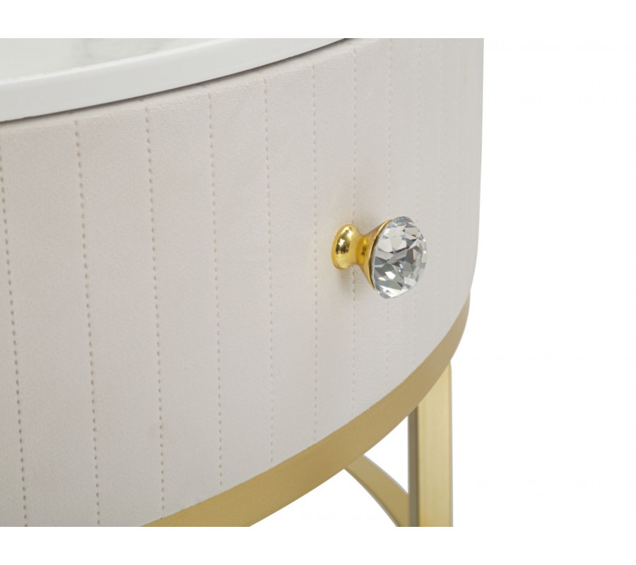 Konferenčný stolík Glamia Tapisé zaujme okrúhlym tvarom a prepracovanými detailmi. Korpus je potiahnutý zamatovou látkou v béžovej farbe, kde jemné zvislé prešívanie vytvára elegantný prúžkovaný efekt. Stolík obsahuje dve zásuvky s úchytkami, ktoré pripomínajú kryštál a pridávajú stolíku luxusný šmrnc.