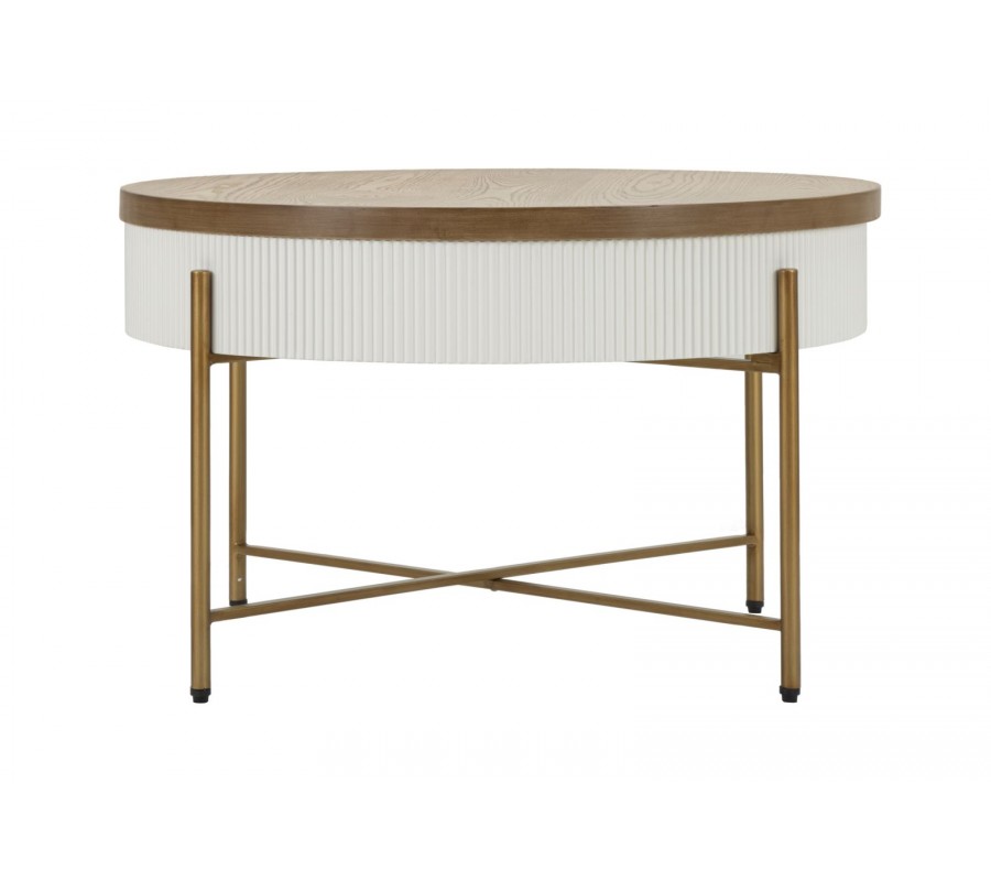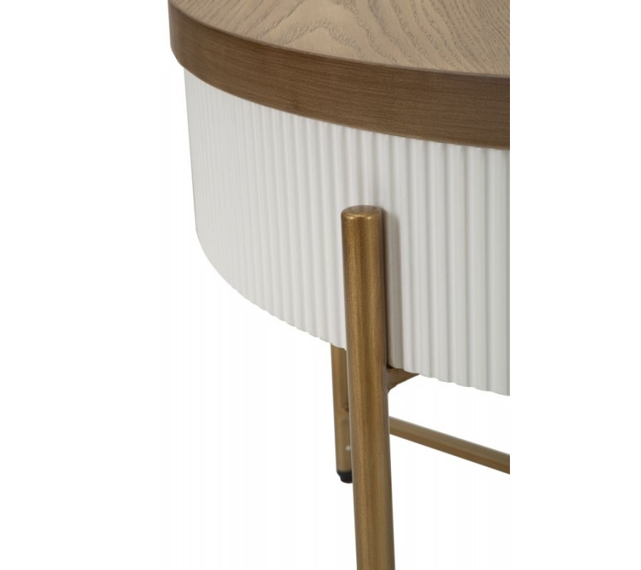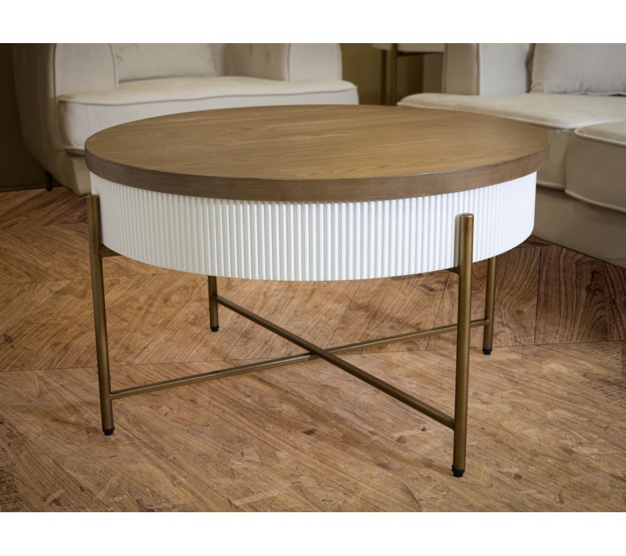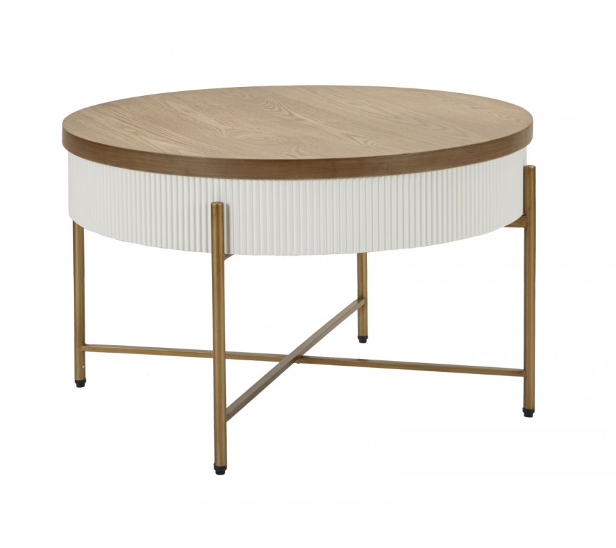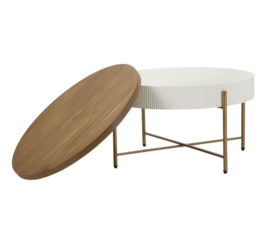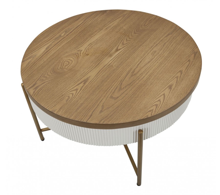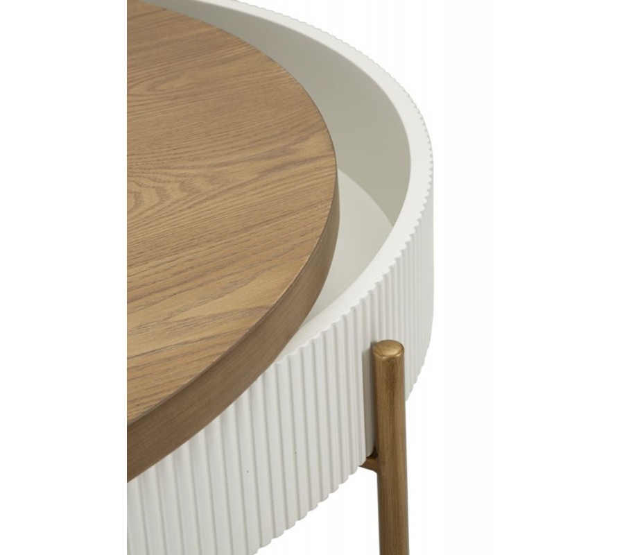 Konferenčný stolík má okrúhly tvar, s vrchnou doskou v prírodnej svetlej hnedej farbe. Jej povrch zdobí kresba letokruhov a prináša do dizajnu pocit tepla. Pod ňou sa nachádza telo stolíka v bielej farbe. Jeho obvod zdobí vertikálny drážkovaný reliéf, ktorý je veľmi obľúbený v art deco štýle. V spojení s bielou farbou pôsobí čistým a elegantným dojmom. Telo stolíka vám tiež poskytuje praktický úložný priestor, ktorý sa uzatvára vrchnou doskou.
