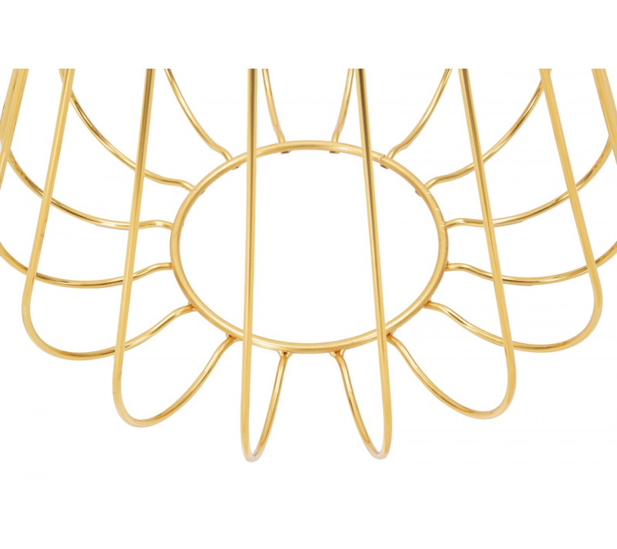 Kovová konštrukcia v zlatej farbe má výrazný sochársky tvar, ktorý pripomína rozširujúcu sa laliovú siluetu. Úzke kovové prúty sa plynulo ohýbajú a vytvárajú vzdušnú a elegantnú základňu, pričom sú prepojené v spodnej časti kruhovým rámom pre stabilitu a harmonickú rovnováhu.