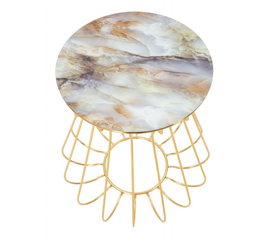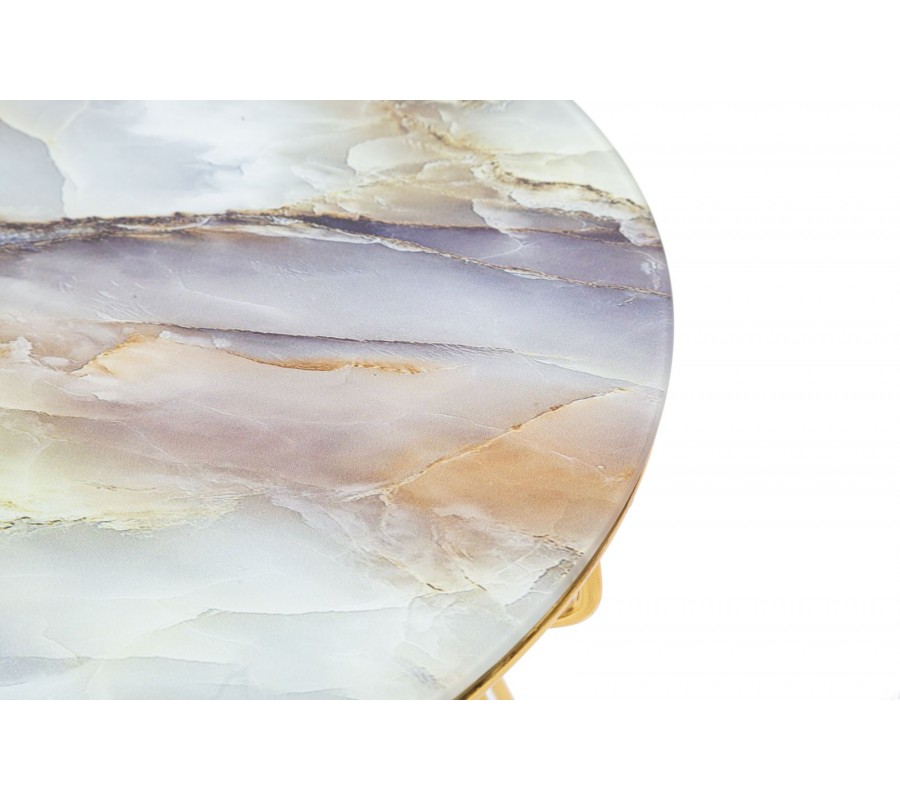 Konferenčný stolík Naris je luxusným dizajnovým kúskom, ktorý v sebe spája eleganciu glamour štýlu s výraznými art deco prvkami. Okrúhla sklenená doska vyniká unikátnym farebným prevedením, kde sa jemné odtiene krémovej, béžovej, svetlofialovej, sivej a hnedej prelínajú do mramorového efektu, čím vytvárajú exkluzívny a sofistikovaný vzhľad.
