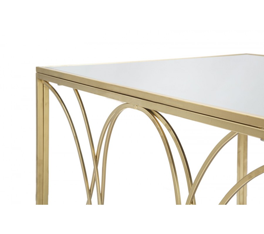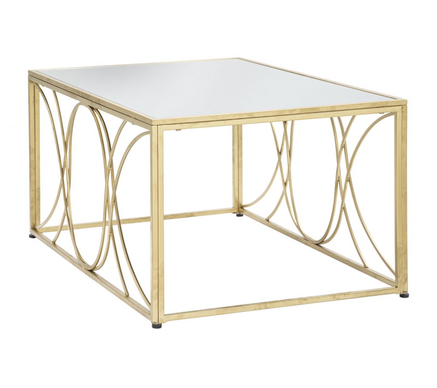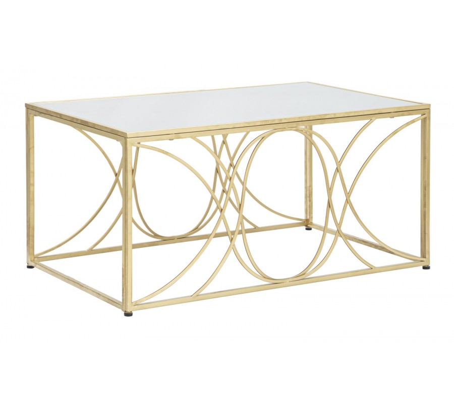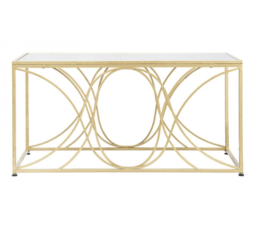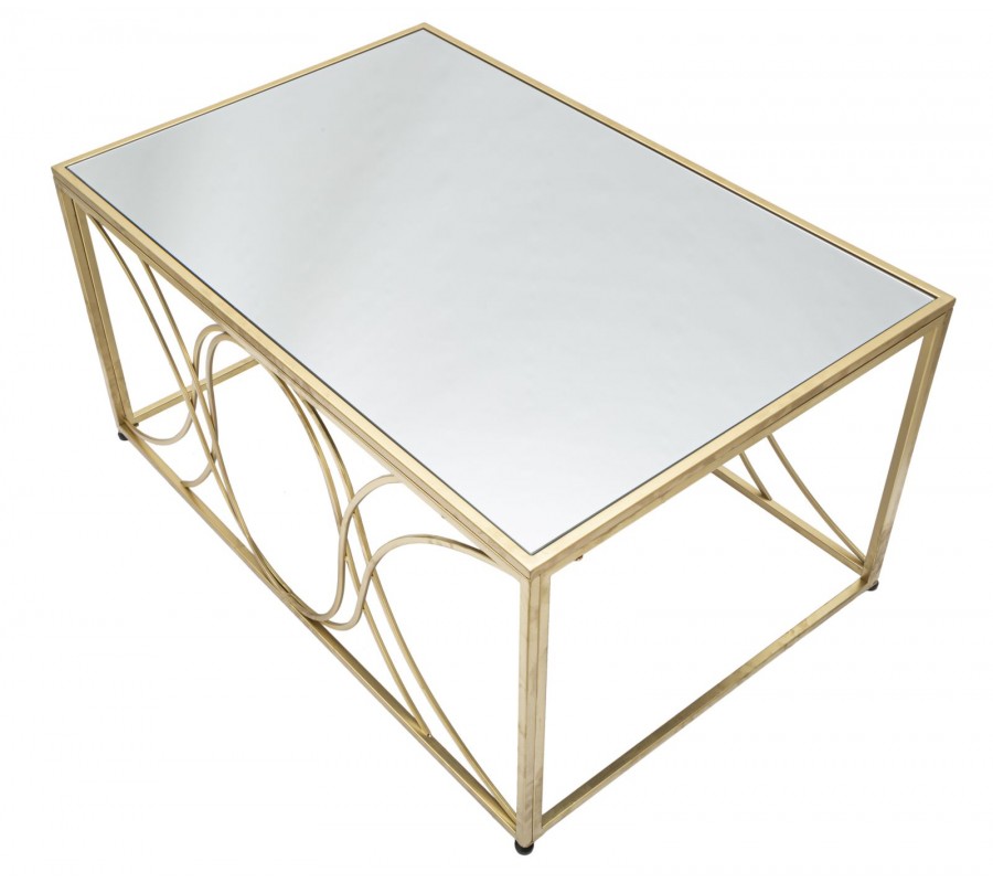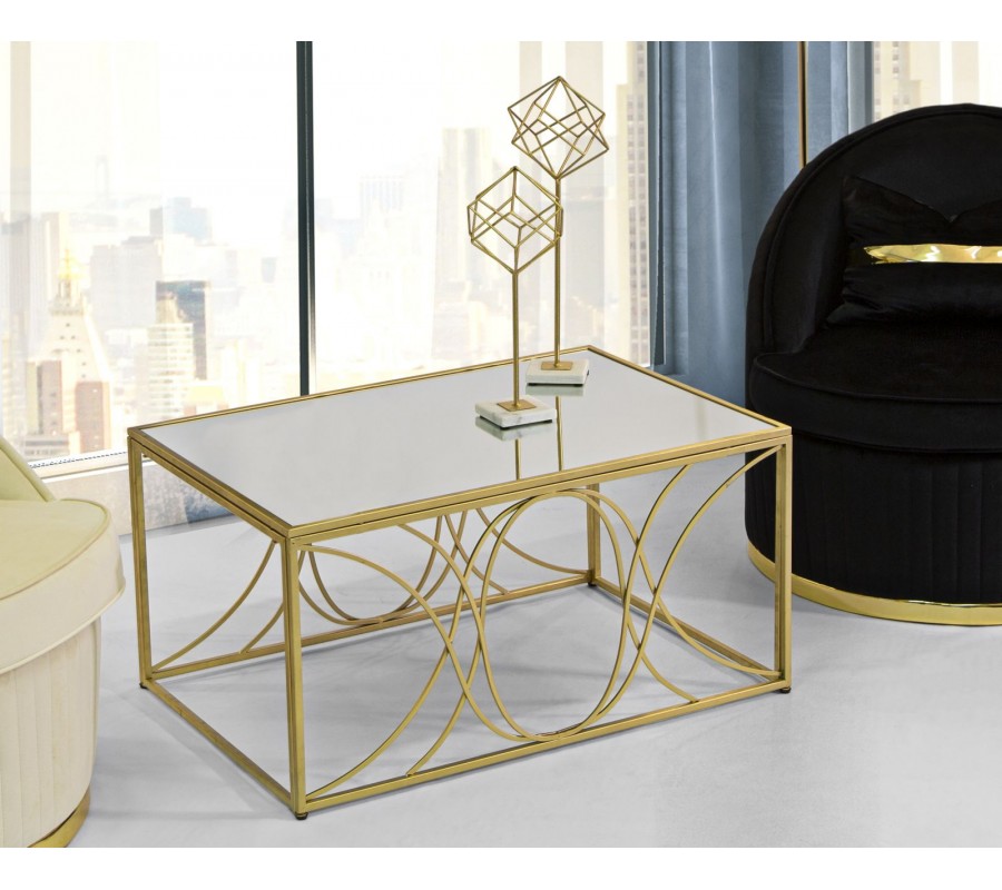 Art deco obdĺžnikový zlatý kovový konferenčný stolík Lonia s ohnutými tyčami s vrchnou zrkadlovou doskou 90 cm