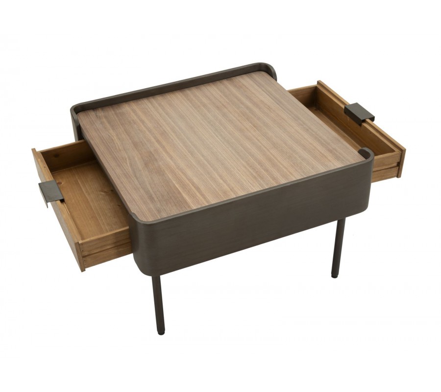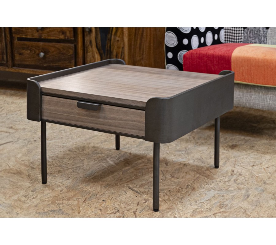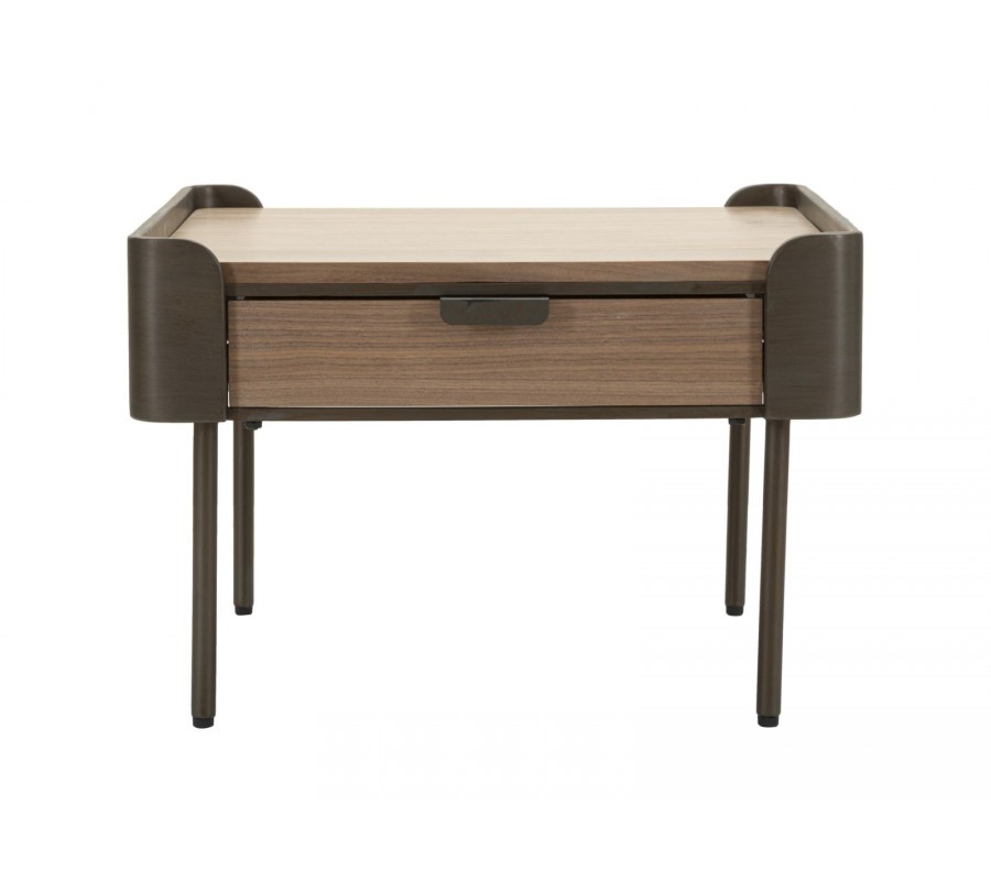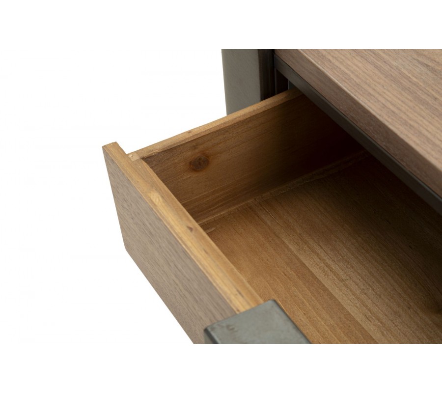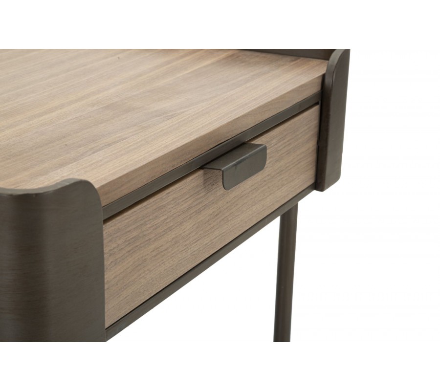 Stolík je vyrobený z dreva v hnedej farbe s výraznou štruktúrou, ktoré mu dodáva prirodzený a teplý vzhľad. Vrchná doska a dve zásuvky na protiľahlých stranách poskytujú dostatok úložného priestoru na drobnosti. Kovové steny na zostávajúcich dvoch stranách majú oblé hrany a dotvárajú jeho robustný charakter a zabezpečujú stabilitu.