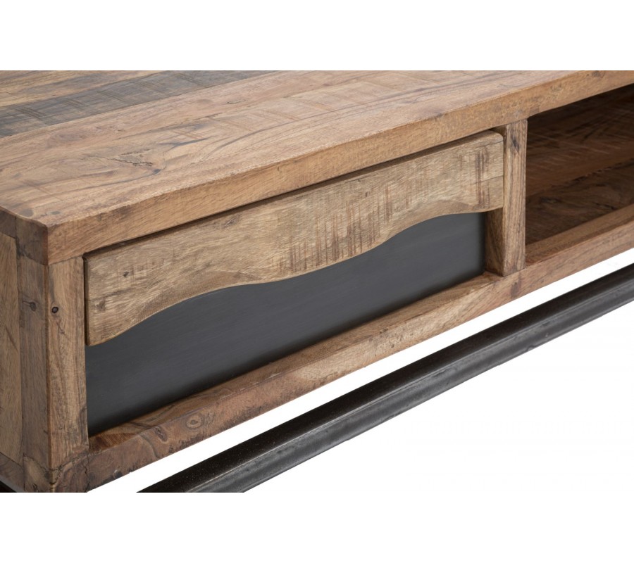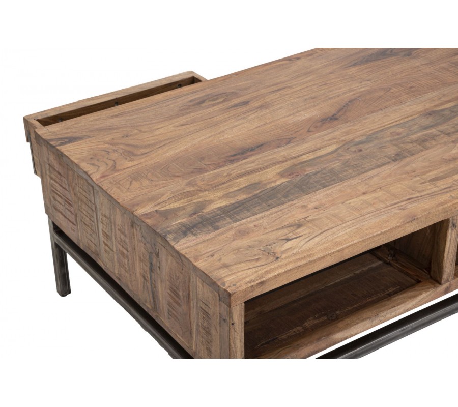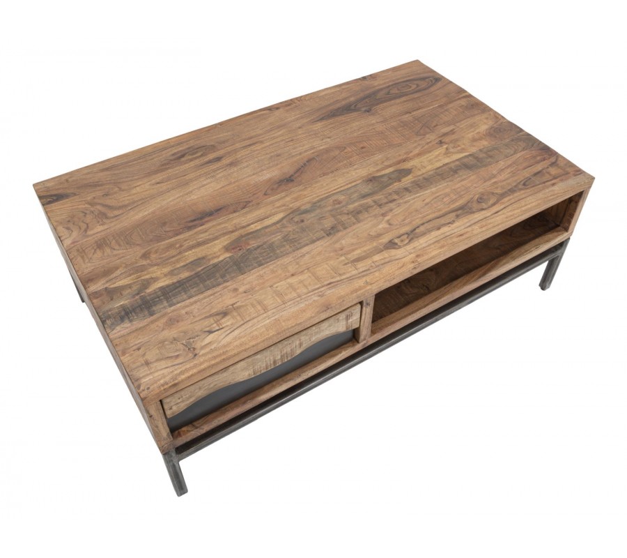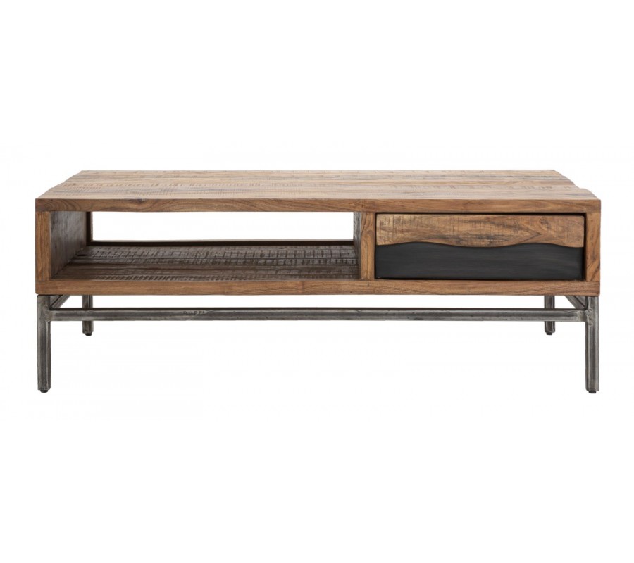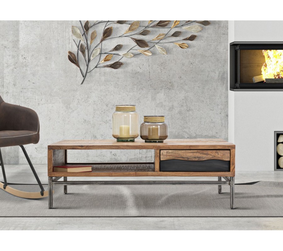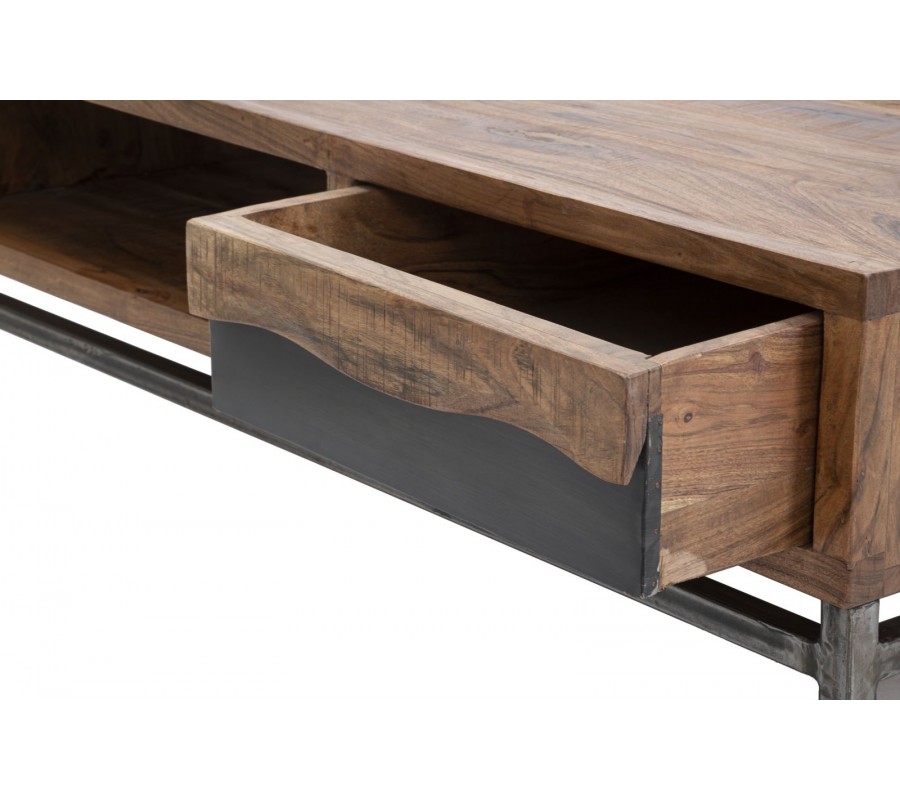 Industriálny masívny hnedý obdĺžnikový konferenčný stolík Berignone s poličkou a so zásuvkou s tmavým hnedým detailom 118 cm