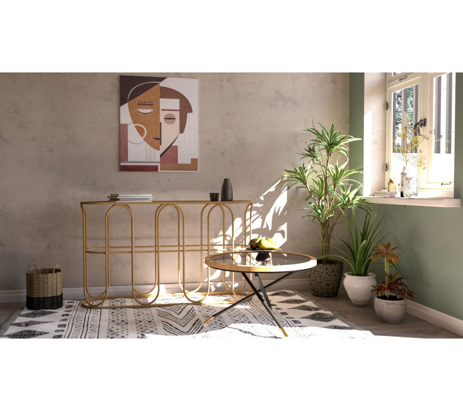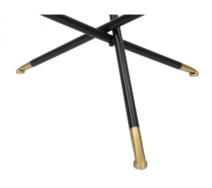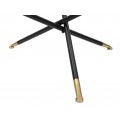 Podnož tvoria tri prekrížené kovové nožičky v čiernej matnej farbe, ktoré dodávajú stabilitu a zároveň pôsobia elegantne a subtílne. Konce nožičiek sú zdobené zlatými detailmi s guľovým zakončením, čím stolík nadobúda luxusný nádych v štýle art deco.