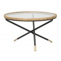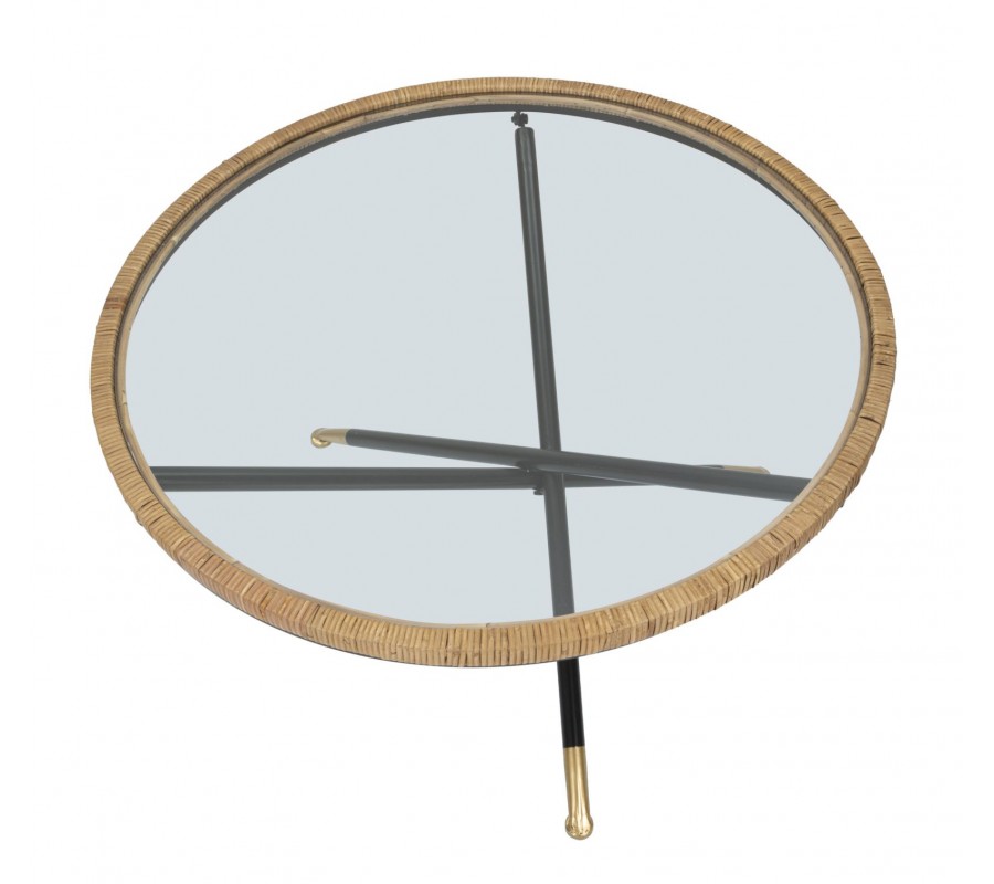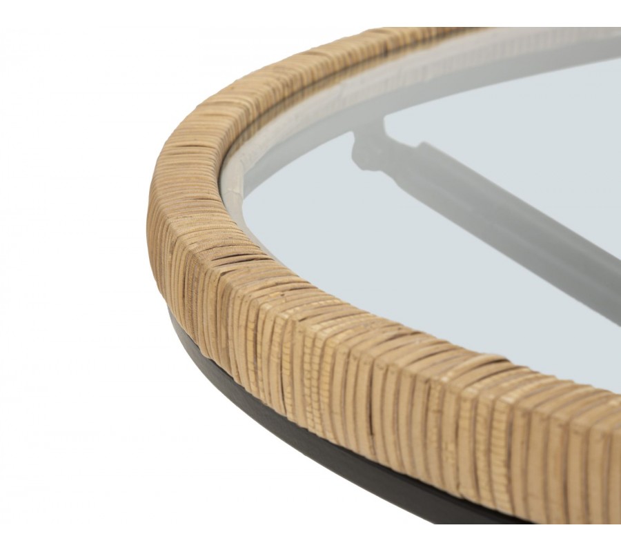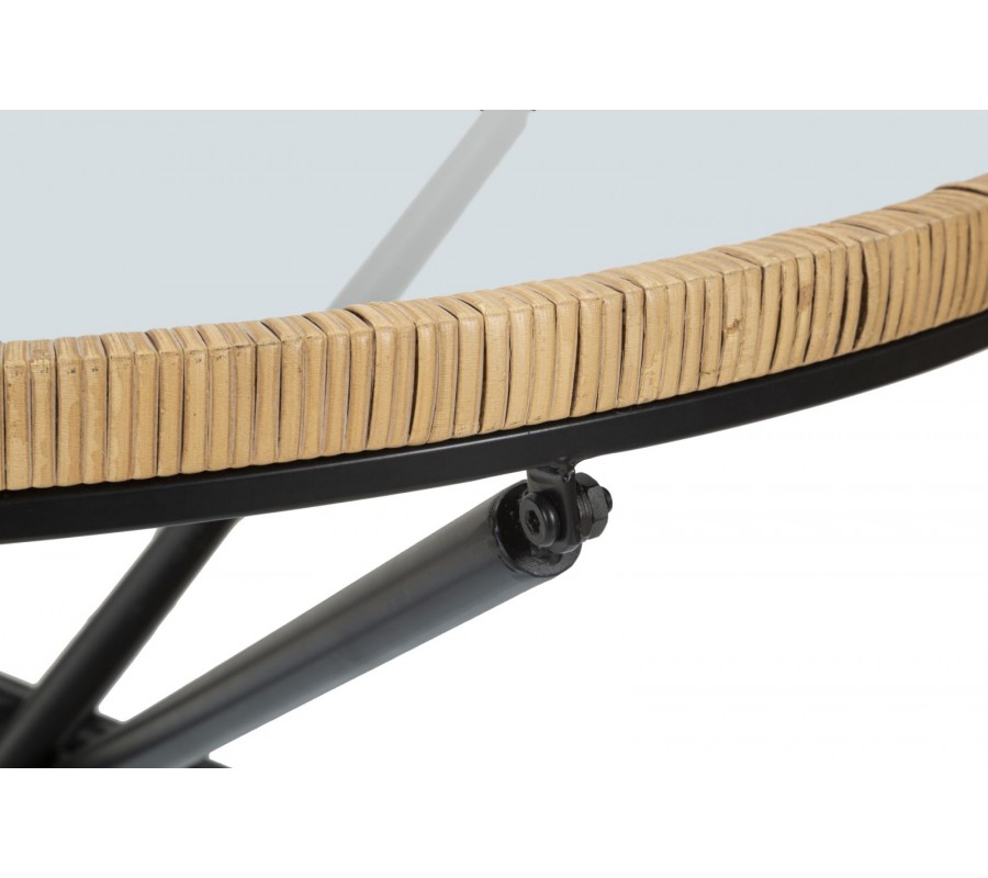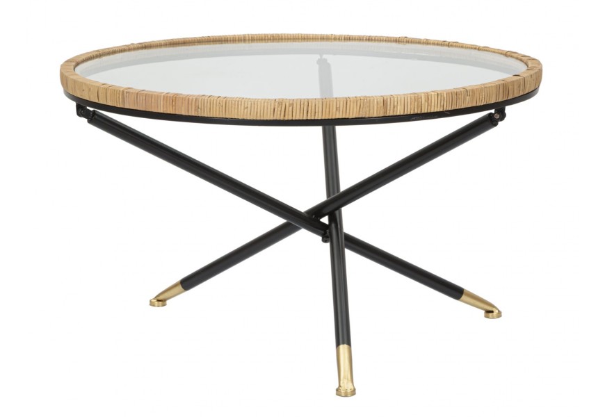 Moderný okrúhly konferenčný stolík Pavone s vrchnou sklenenou doskou s ratanovým rámom s prekríženými čiernymi nožičkami 80 cm