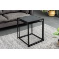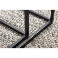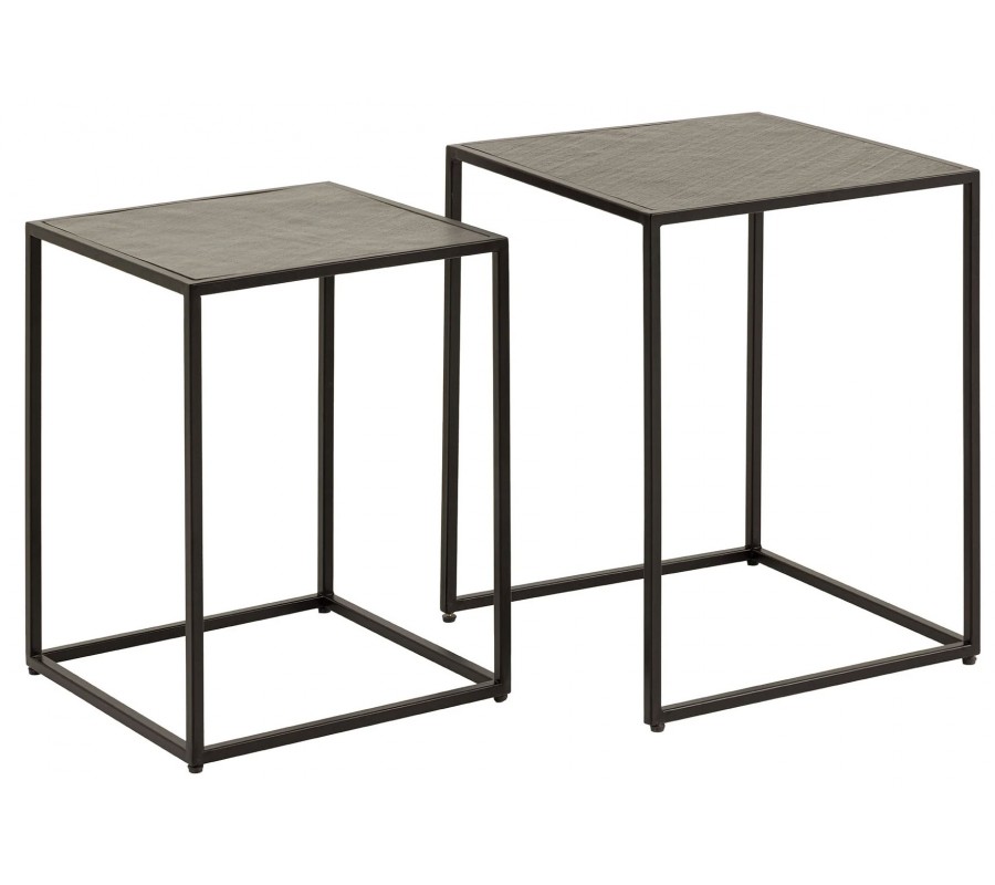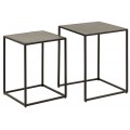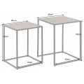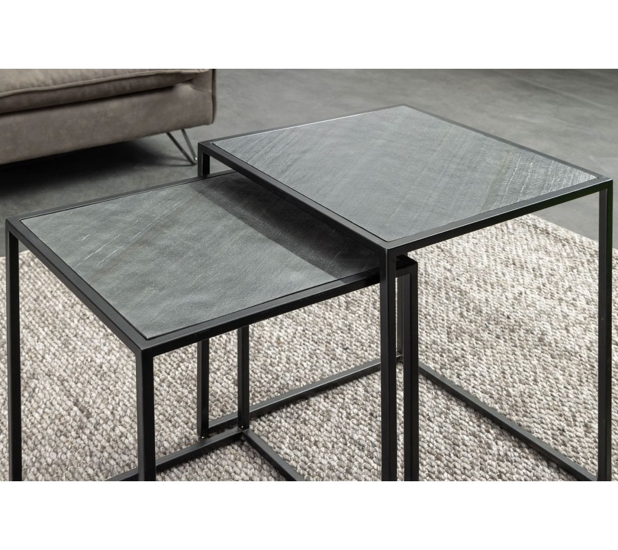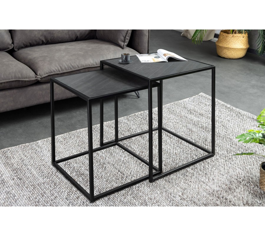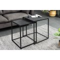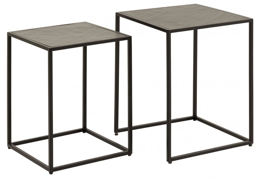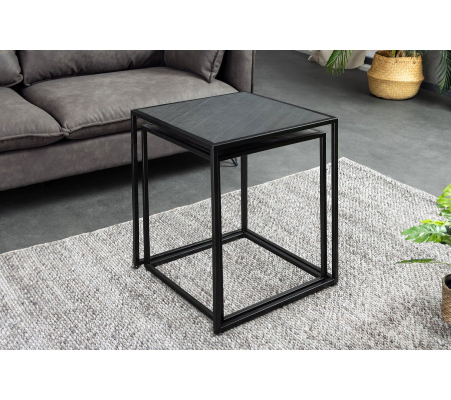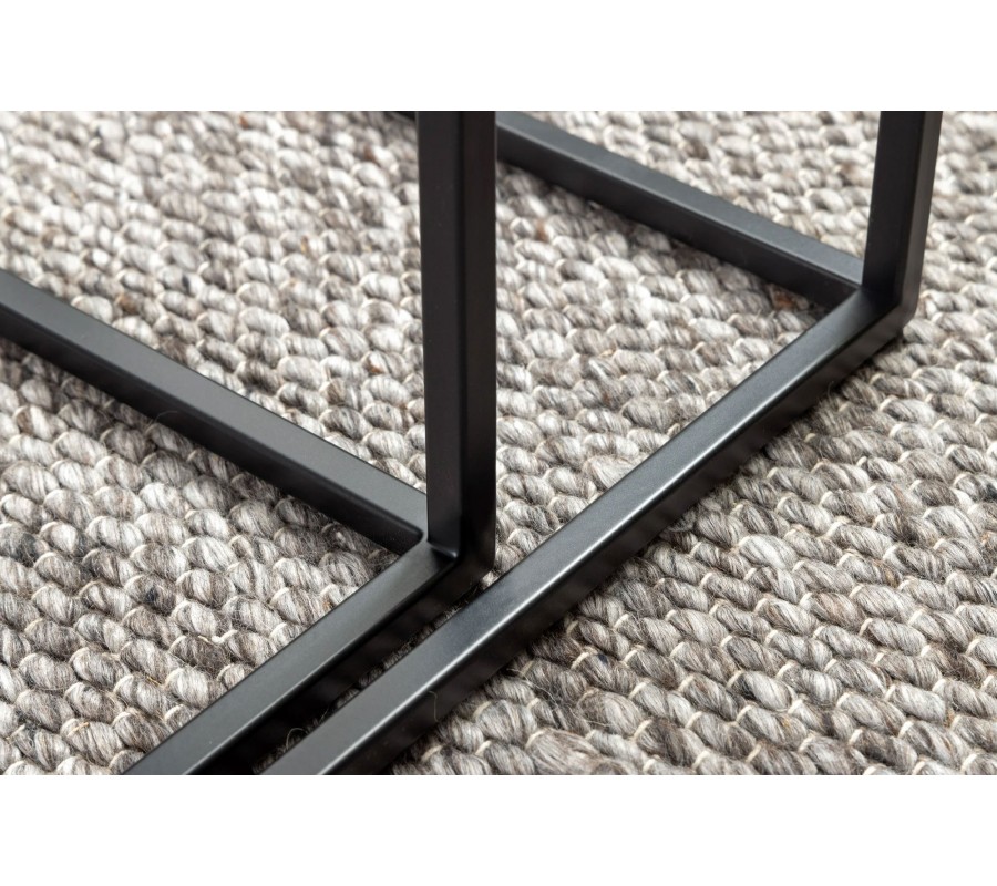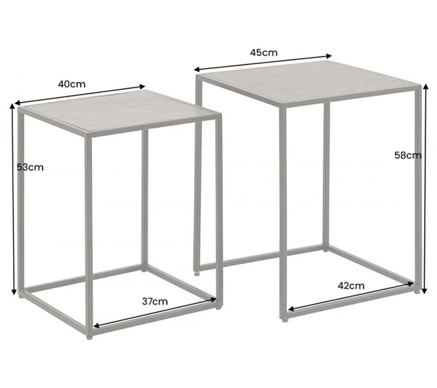 Konštrukcia je stabilná vďaka čiernym kovovým podstavám so štvorcovým geometrickým rámom, ktoré dodávajú industriálny charakter a zabezpečujú pevnosť. Premyslený dizajn umožňuje menší stolík (40 × 37 × 53 cm) zasunúť pod väčší (45 × 42 × 58 cm), čo poskytuje praktické riešenie na úsporu miesta.