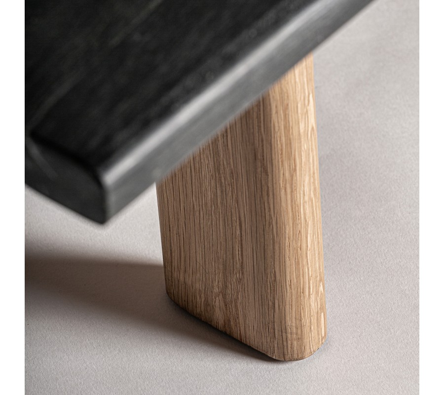 Luxusný škandinávsky konferenčný stolík Naria v obdĺžnikovom tvare spája eleganciu prírodného dubového dreva a mramoru, čím vytvára exkluzívny a zároveň funkčný prvok do interiéru. Vrchná doska , zložená z dvoch častí, z čierneho mramoru s jemnými bielymi žilkami dodáva stolíku sofistikovaný vzhľad, pričom jej zaoblené hrany prispievajú k jemnejšiemu a plynulejšiemu dizajnu.