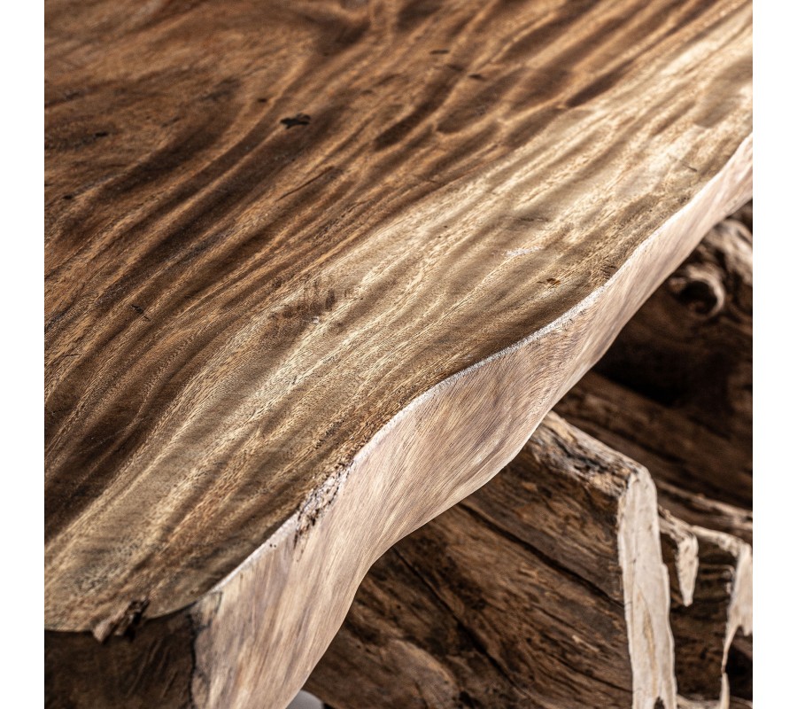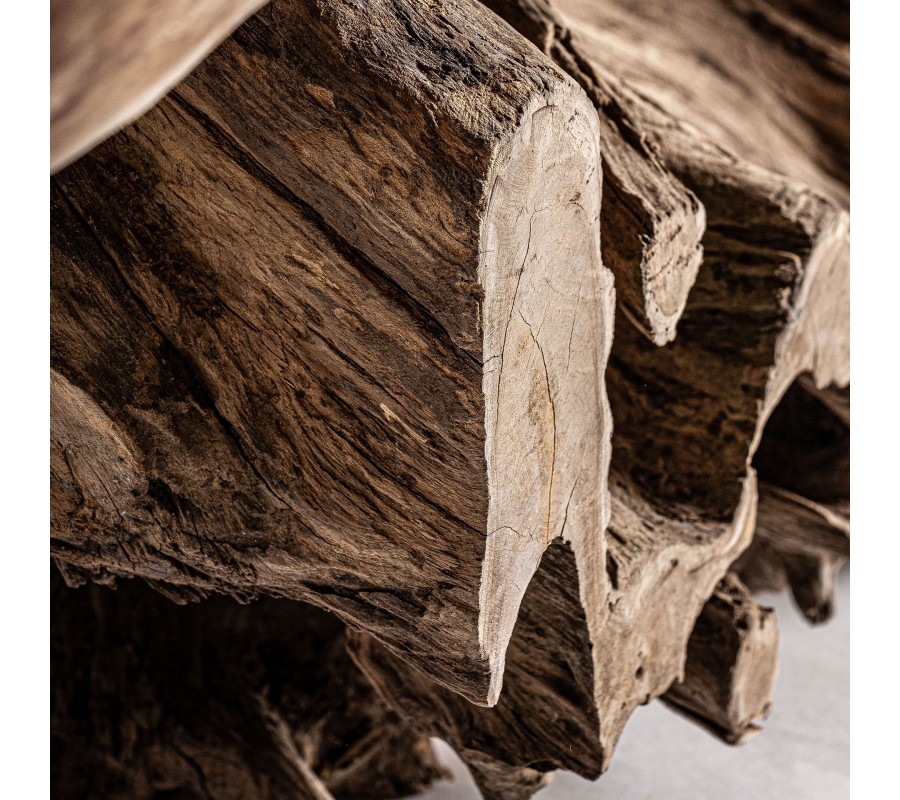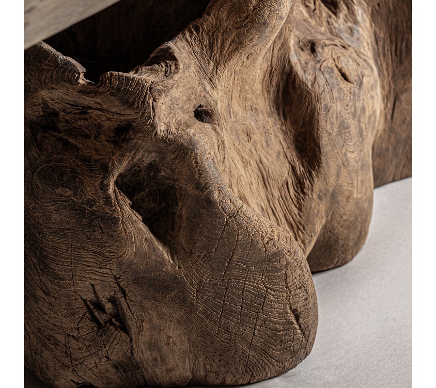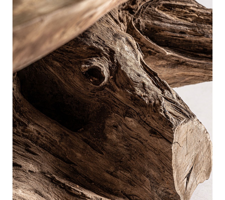 Najvýraznejším prvkom stolíka je atypická podnož v organickom tvare, vyhotovená z prírodného koreňového systému suarového stromu. Každý kus má jedinečný tvar, s nepravidelnými priehlbinami, dierami a štruktúrami, ktoré pripomínajú sochárske dielo. Tento prírodný základ dodáva stolíku sochársky a surový výraz, ktorý z neho robí centrálny prvok v miestnosti.