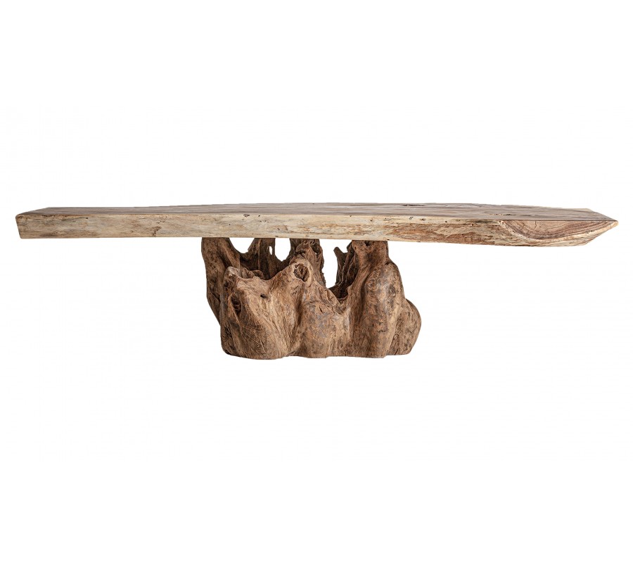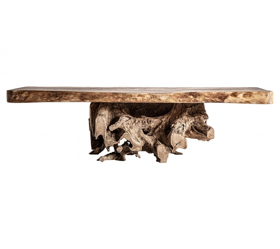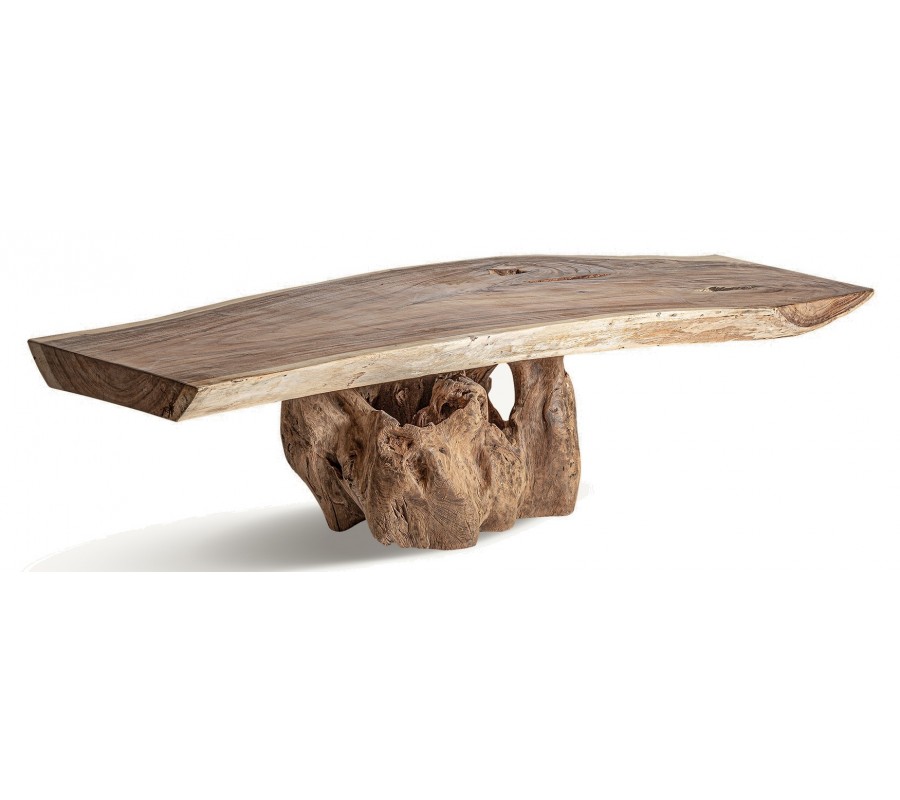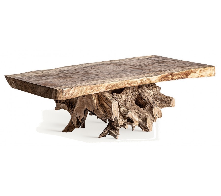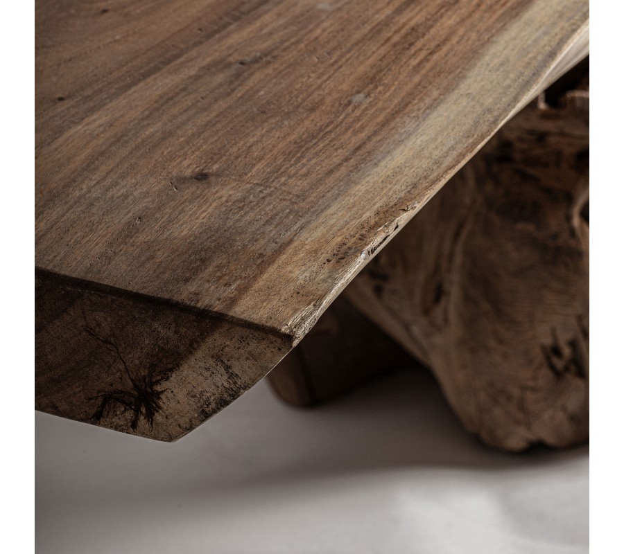 Luxusný etno masívny obdĺžnikový konferenčný stolík Halis zo suarového dreva v hnedej farbe s atypickou prírodnou nohou 200 cm
