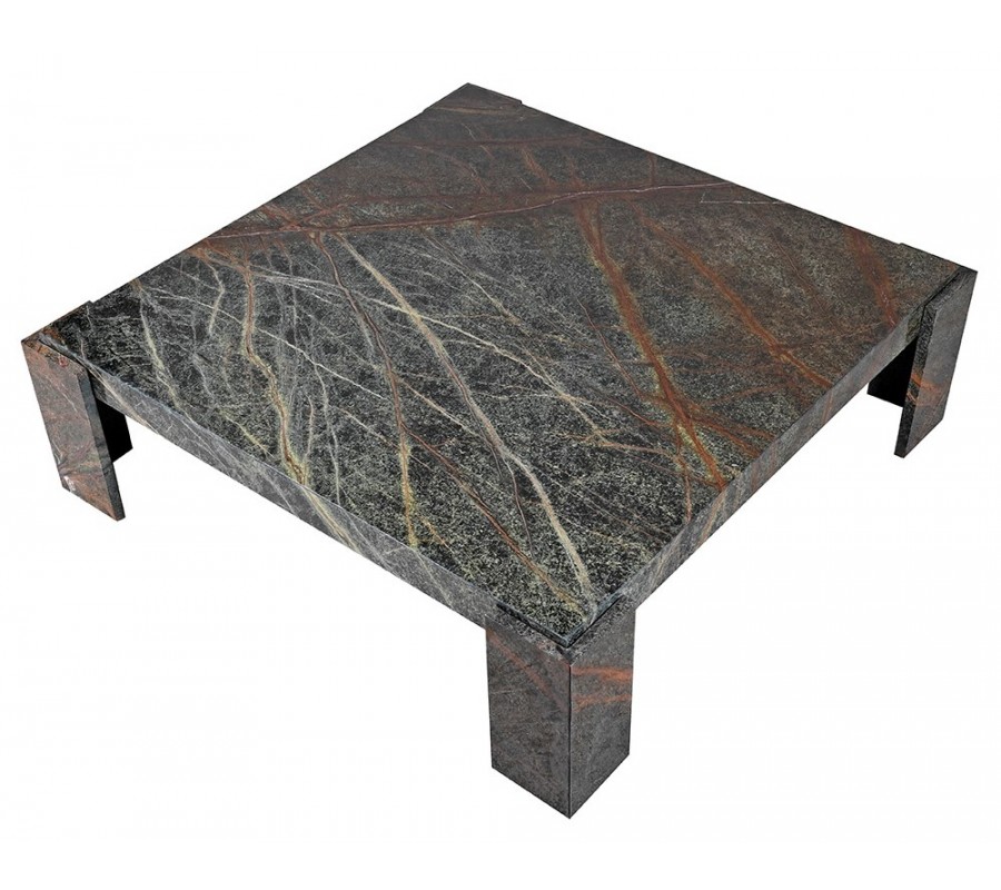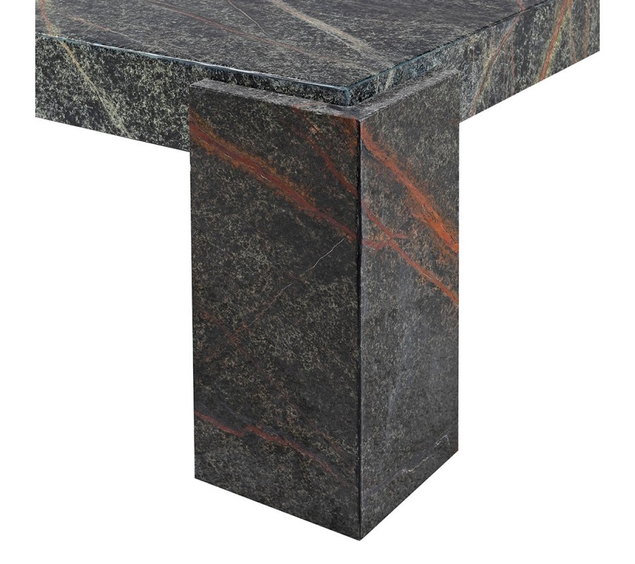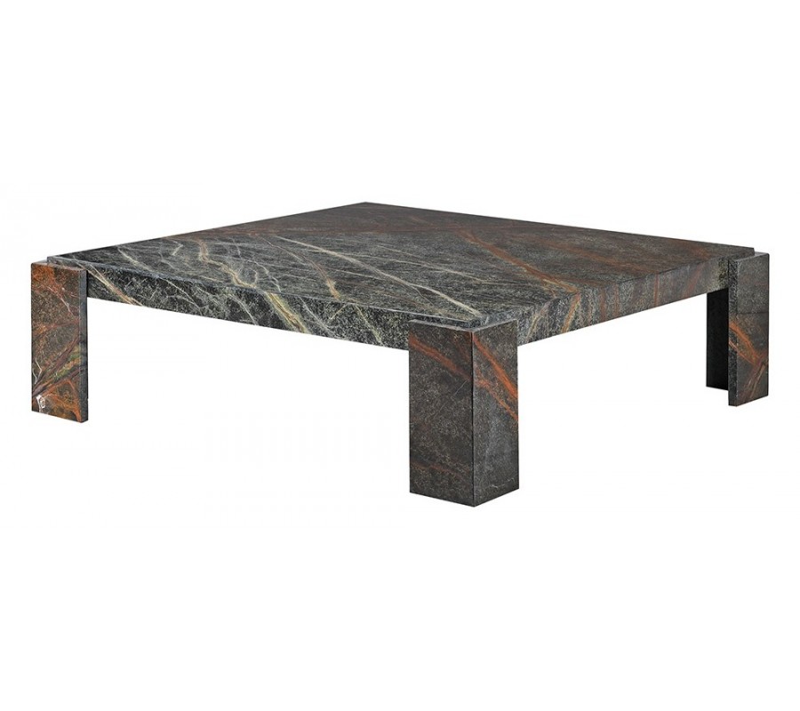 Moderný konferenčný stolík Garen v štvorcovom tvare zaujme svojím luxusným a zároveň industriálnym vzhľadom. Je vyrobený z masívneho mramoru v čiernej farbe so zaujímavým žilkovaním v červeno-oranžových tónoch, ktoré vytvára efekt korózie a dodáva mu dramatický charakter. Stolová doska aj mohutné hranaté nožičky pôsobia stabilne a zároveň elegantne, pričom minimalistický dizajn necháva vyniknúť jedinečnú štruktúru prírodného kameňa. Kovová konštrukcia v čiernej farbe podčiarkuje industriálny nádych celku.