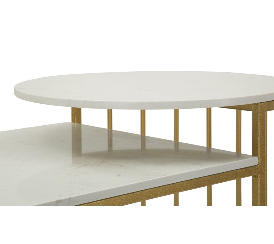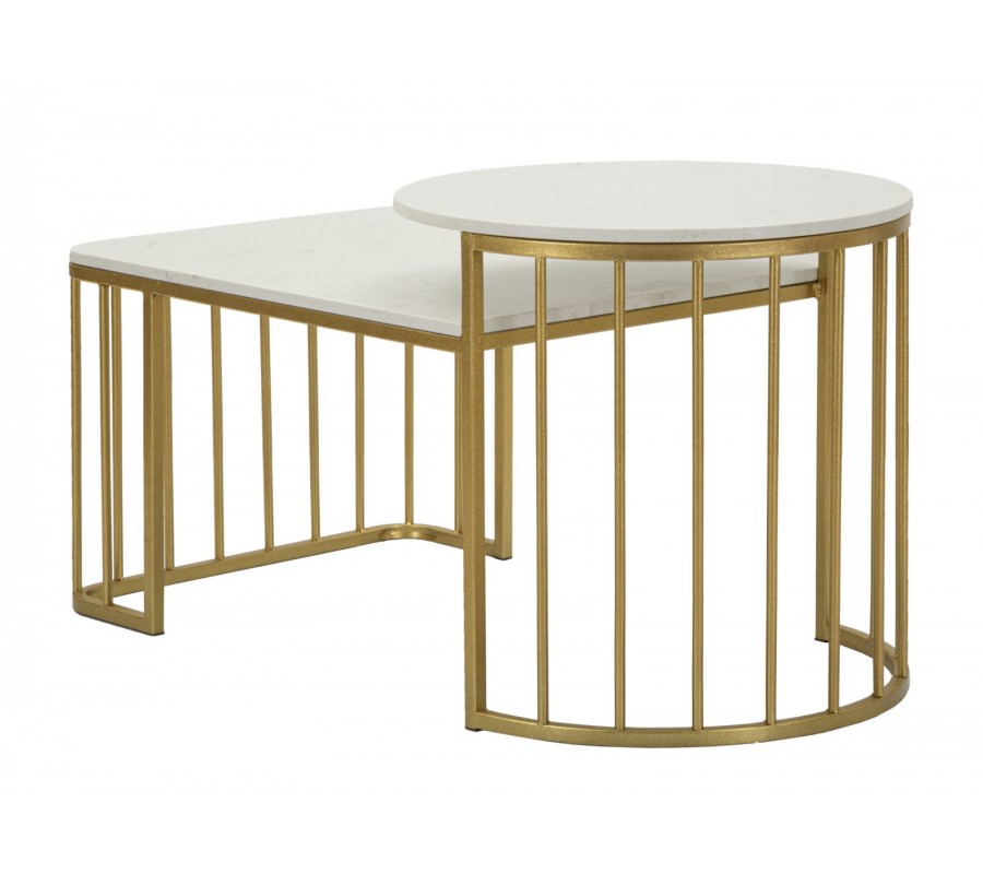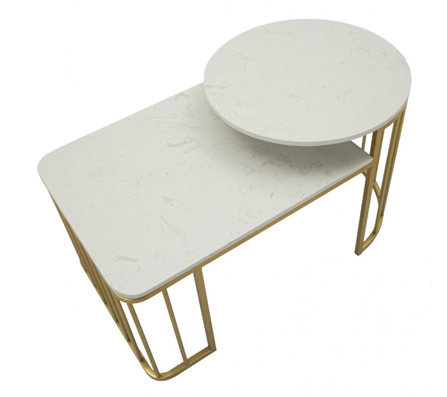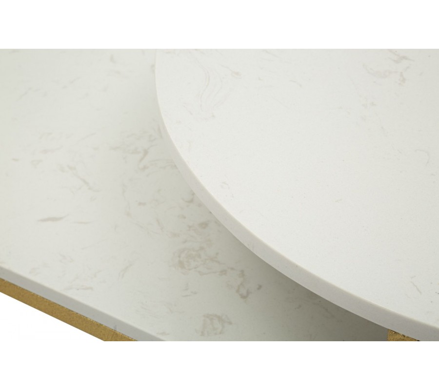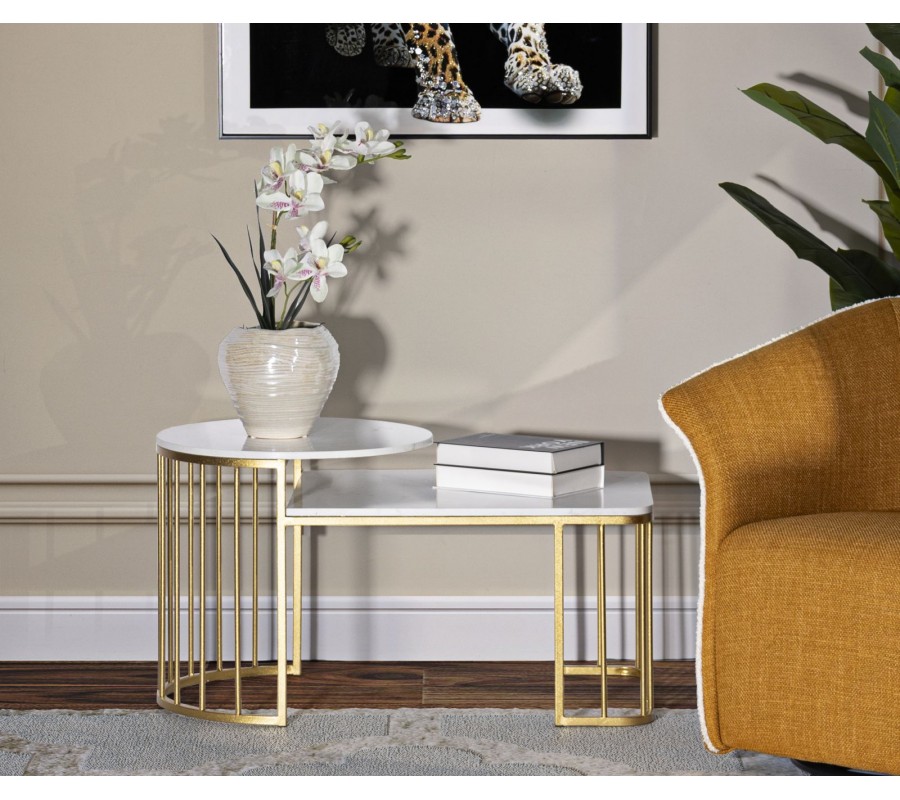 Konferenčný stolík Hera s dvomi doskami, predstavuje dokonalú súhru elegancie, funkčnosti a výrazného art deco dizajnu. Stolíky zaujmú kontrastom medzi luxusným mramorovým povrchom a jemne lesklou kovovou konštrukciou v zlatej farbe. Štruktúra je tvorená zvislými kovovými tyčami, ktoré vytvárajú ľahkú, ale stabilnú oporu pre vrchné dosky a zároveň zdôrazňujú geometrickú čistotu art deco štýlu. Stolík sa skladá z dvoch dosiek – nižšej obdĺžnikovej a vyššej okrúhlej, pričom vďaka rozdielnej výške a šikovnej konštrukcii je možné menšiu zasunúť pod väčšiu, čím vzniká priestorovo úsporné riešenie. Vrchné dosky sú vyrobené s bielym mramorovým dizajnom s jemnými sivými žilkami, ktoré každý kus robia originálnym. Okraje dosiek sú jemne zaoblené, čo ešte viac zvýrazňuje ich sofistikovaný vzhľad a zároveň prispieva k bezpečnosti pri používaní.