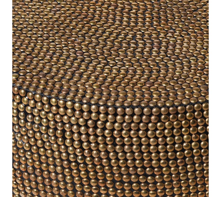 Celý povrch stolíka je zdobený drobne vybíjanými kovovými nitmi v bronzovej farbe, ktoré sú usporiadané tesne vedľa seba v pravidelných kruhoch. Tento rytmický vzor vytvára na vrchnej doske výraznú kružnicovú štruktúru, ktorá pri dopade svetla pôsobí hypnoticky a luxusne. Čierny podklad pod nitmi zvýrazňuje metalický lesk a plastickosť dekoratívneho povrchu.