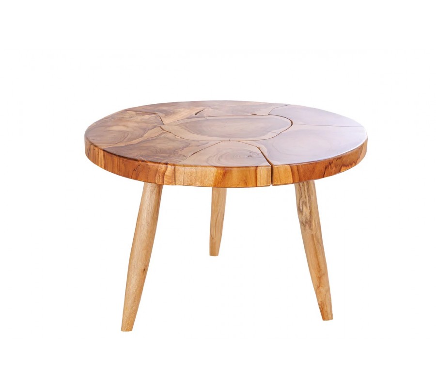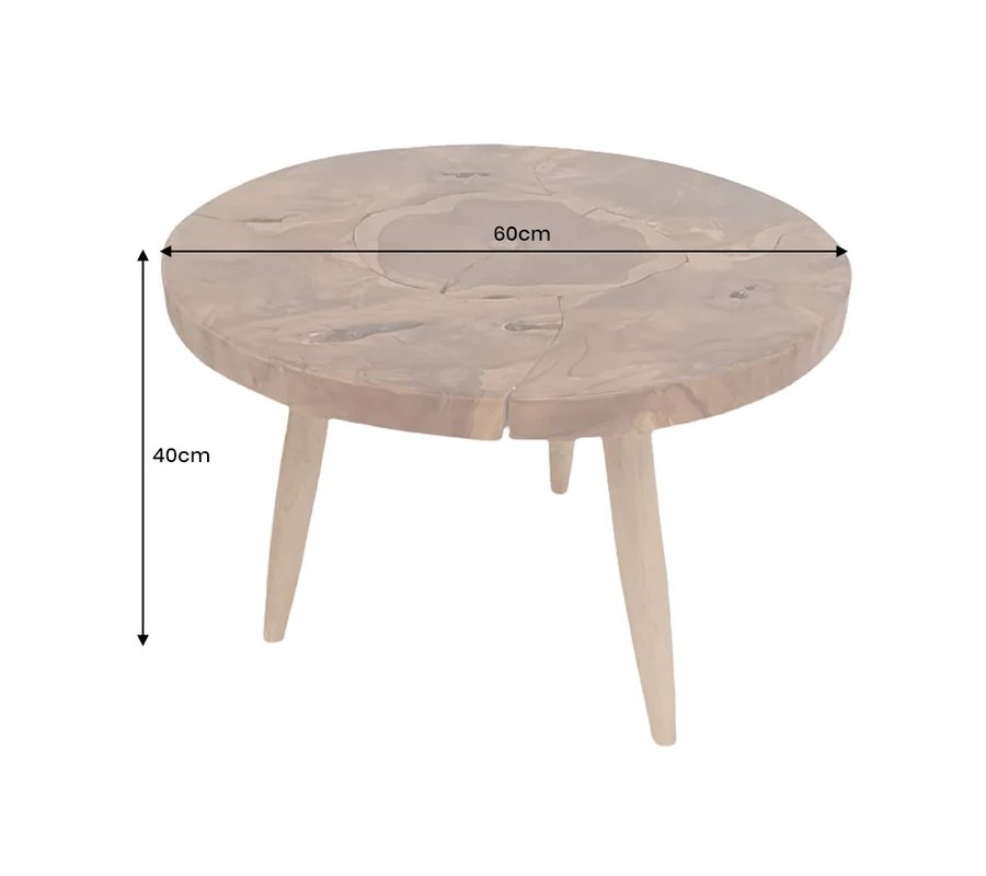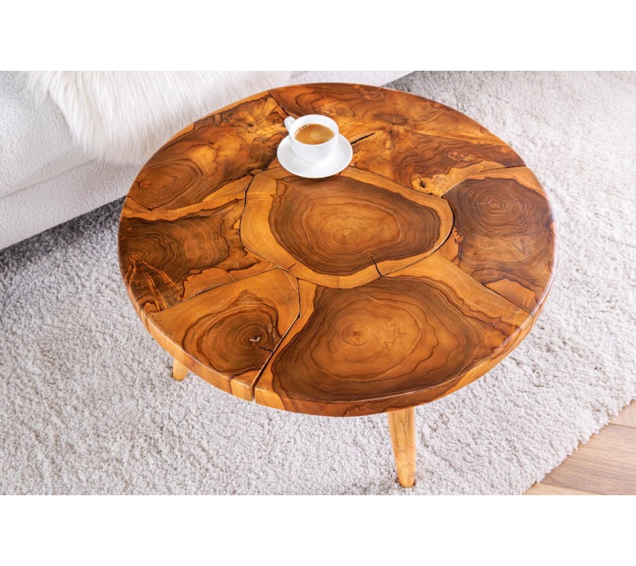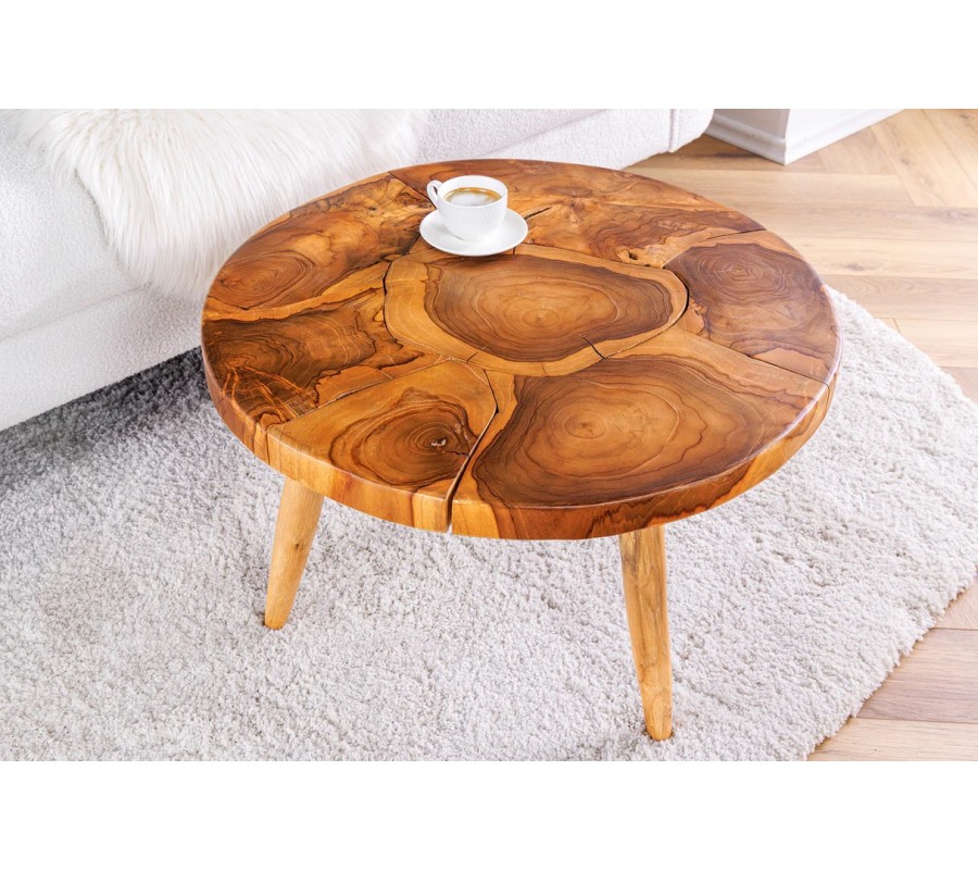 Vidiecky hnedý okrúhly konferenčný stolík Sorin z masívneho teakového dreva s výraznou štruktúrou 60 cm