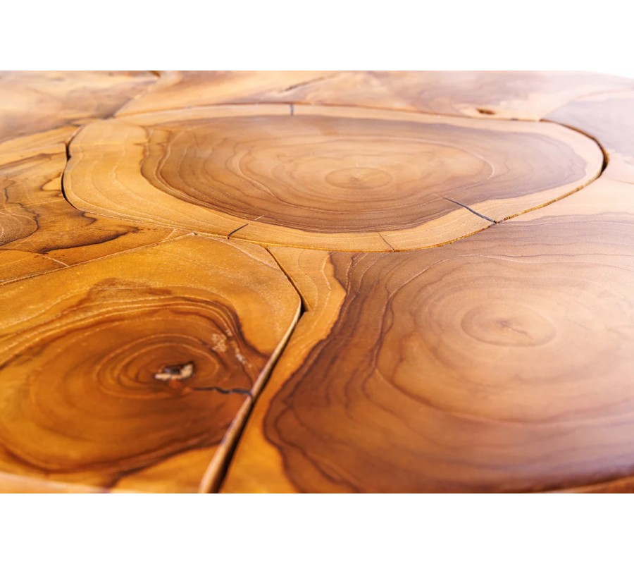 Okrúhla vrchná doska je zložená z nepravidelných segmentov dreva, ktoré spolu vytvárajú efektný mozaikový vzor so zreteľným stredom pripomínajúcim letokruhy. Povrch je jemne lakovaný, čím sa zvýrazňuje prirodzený hnedý odtieň dreva a zároveň sa zvyšuje jeho odolnosť pri bežnom používaní.