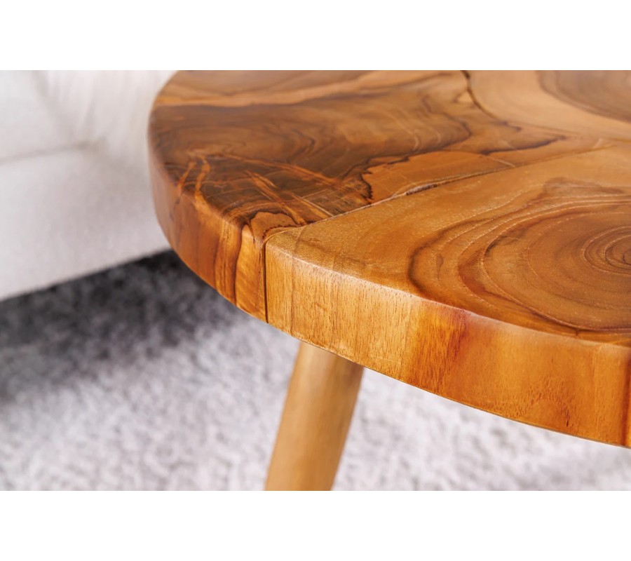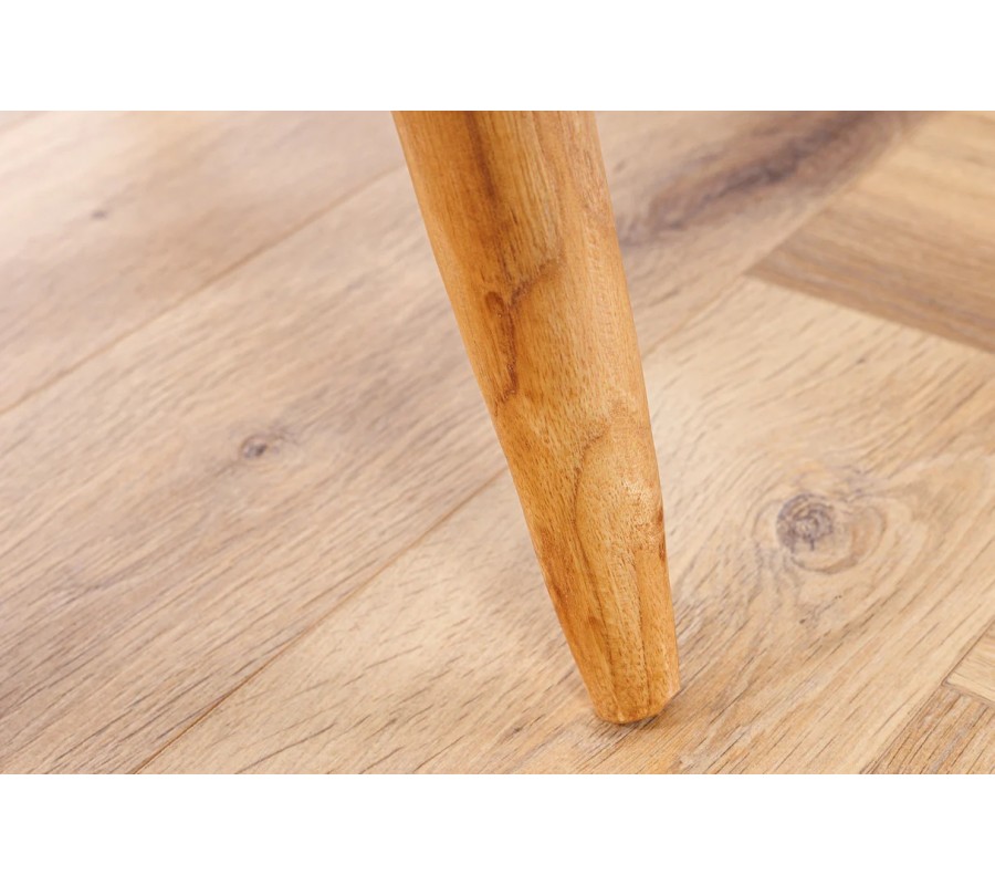 Tri pevné nožičky sa mierne vykláňajú smerom von, čo zaisťuje stabilitu a zároveň dodáva stolíku vizuálnu ľahkosť. Prírodný tvar a ručné spracovanie dreva zachovávajú autentický, organický dojem.
