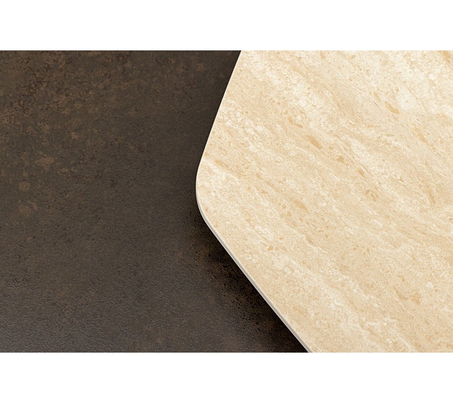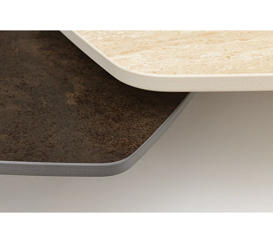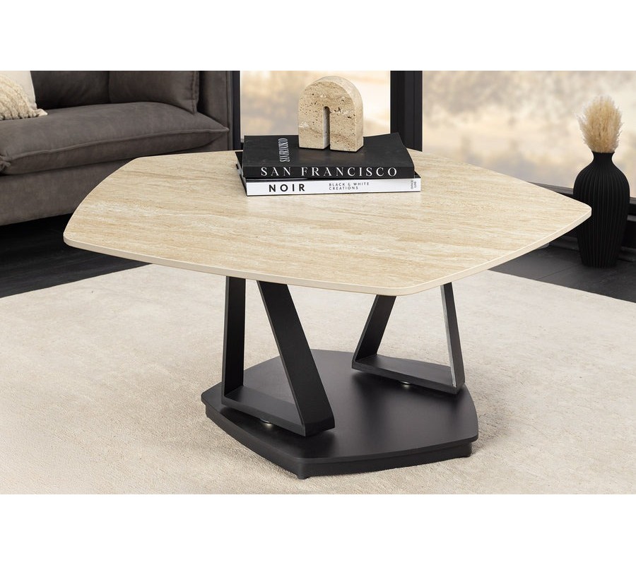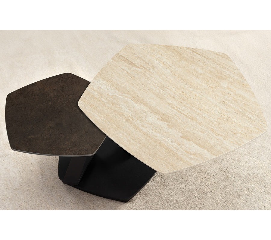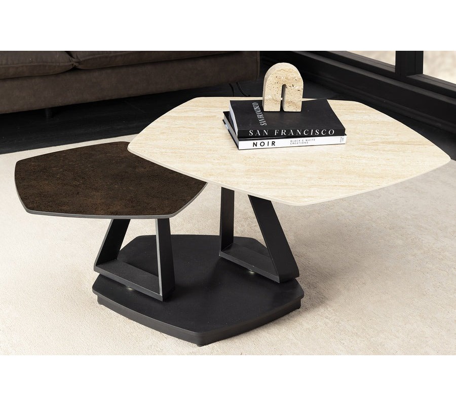 Konferenčný stolík Delin zaujme kombináciou prírodného vzhľadu a moderného pohyblivého dizajnu. Jeho väčšia päťuholníková doska s travertínovým vzorom v béžovej farbe (Ø 80 cm, výška 44 cm) pôsobí elegantne a svetlo, zatiaľ čo menšia čierna doska s efektom hrdze (Ø 50 cm, výška 40 cm) prináša zemitý kontrast a industriálny akcent. Obe dosky majú zaoblené hrany a sú vyrobené z odolnej keramiky.