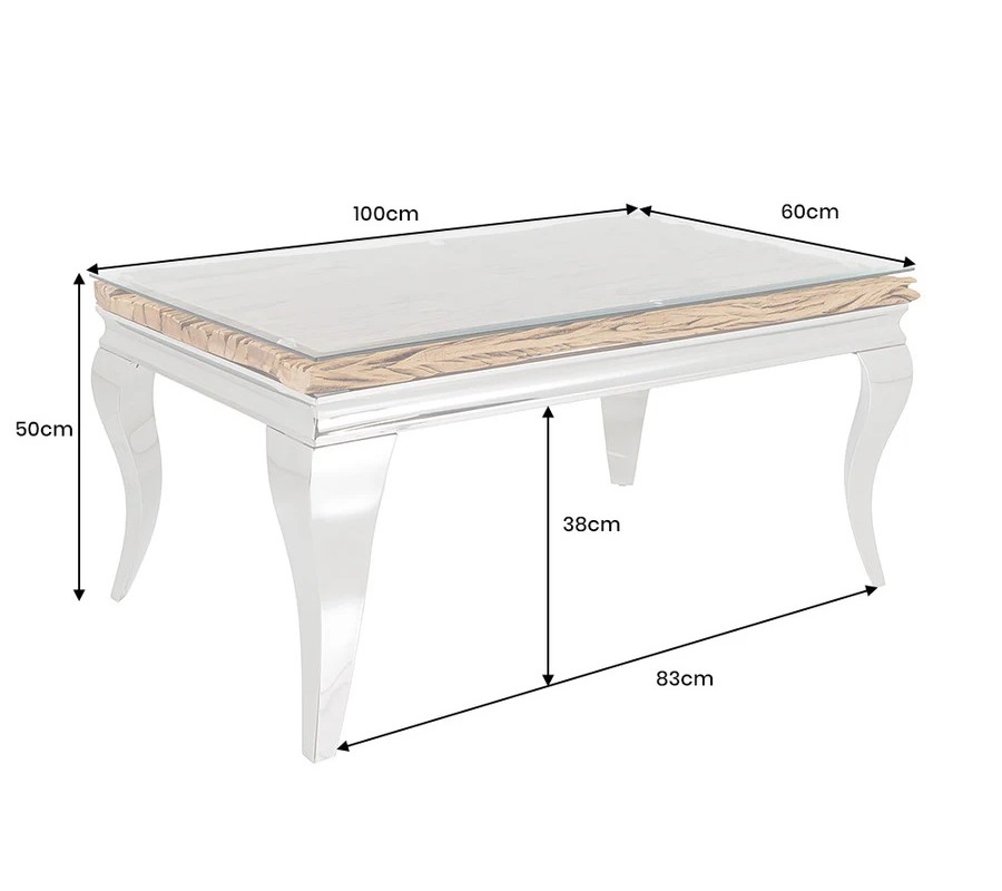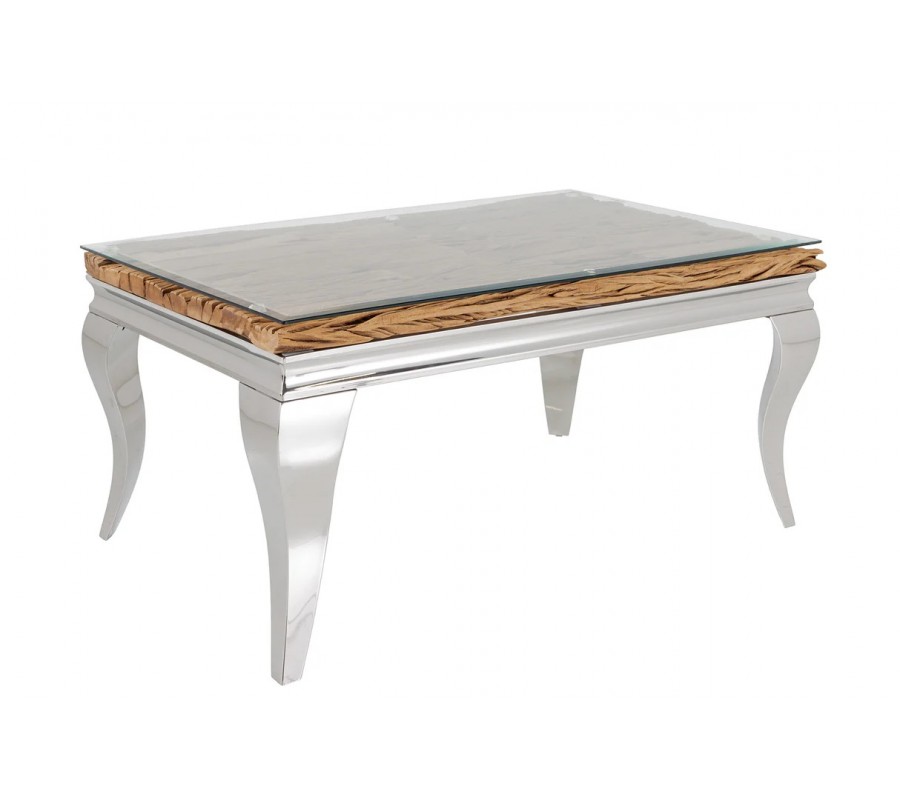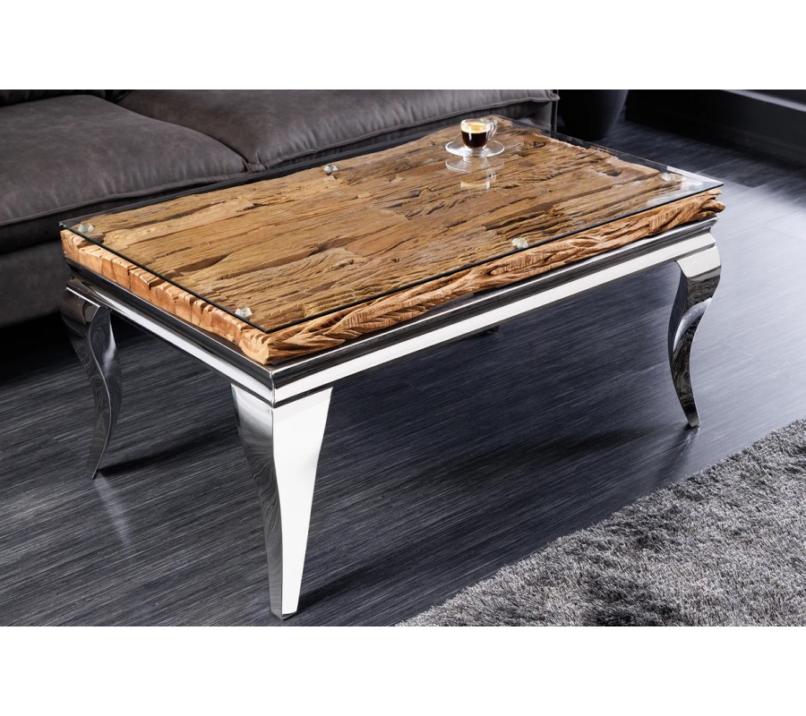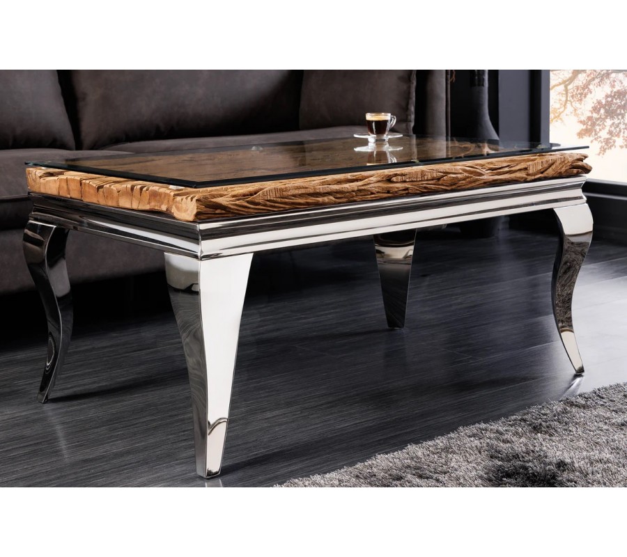 Luxusný dizajnový obdĺžnikový konferenčný stolík Modern Barock s chrómovou podstavou a doskou zo skla a masívneho dreva 100 cm