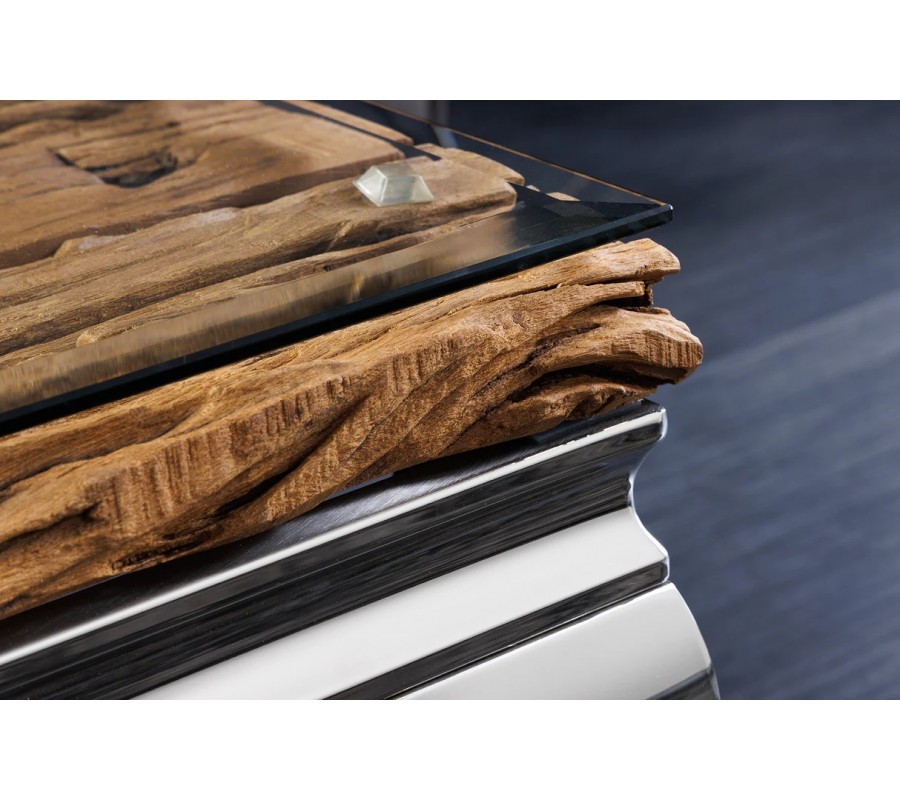Stolík má obdĺžnikovú vrchnú dosku z teakového dreva, prekrytého vrstvou bezpečnostného skla. Masívne drevo v teplej hnedej farbe má výraznú štruktúru s prasklinami a uzlami, čo prináša do dizajnu unikátny dekoratívny prvok. Sklo ho chráni a zároveň vám poskytuje pevný a ľahko udržiavateľný povrch, ideálny na každodenné používanie.