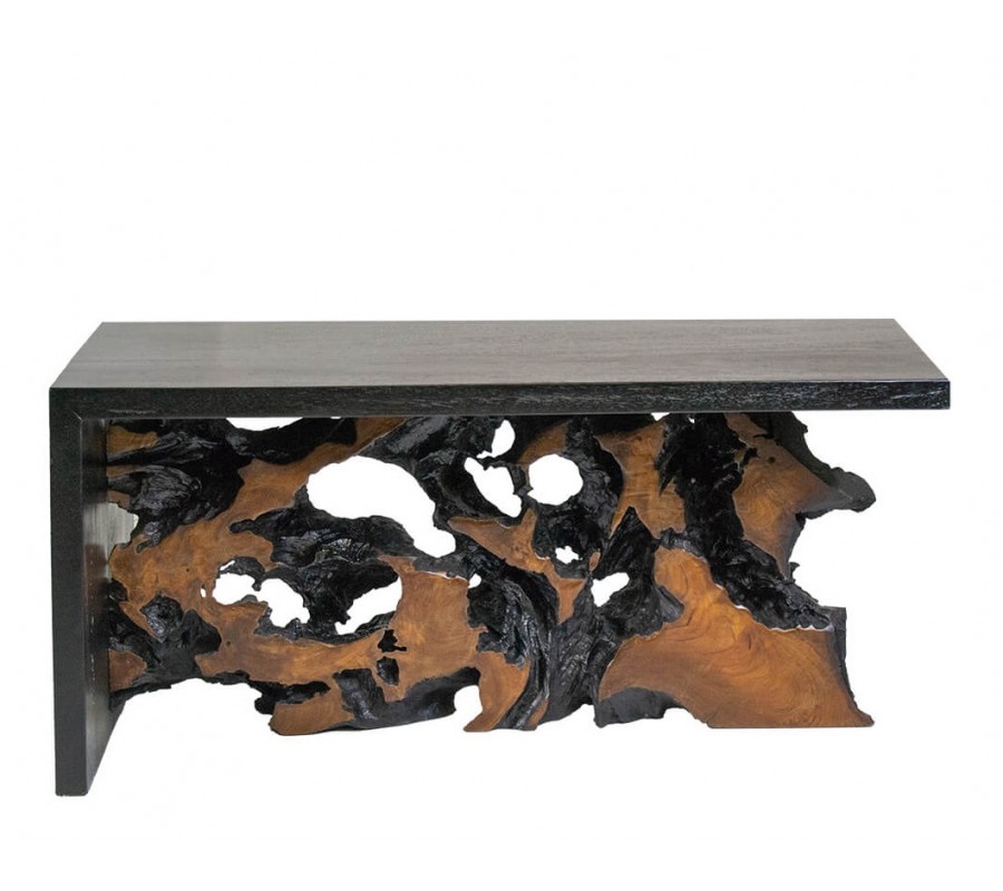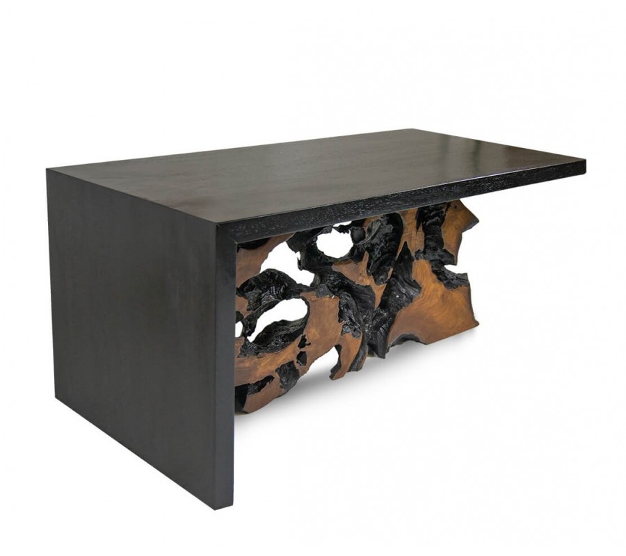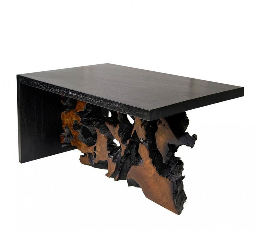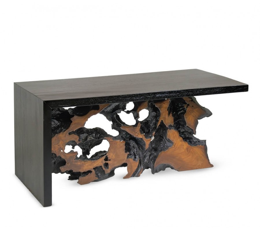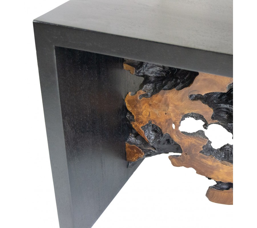 Pod doskou je umiestnená štýlová podstava vyrobená z dreva z koreňového systému. Vo svojom dizajne zúročuje unikátne organické tvary materiálu a každý kus nábytku je tak jedinečným originálom. Kombinácia čiernej a naturálnej hnedej farby vytvára vizuálnu hĺbku a zároveň podčiarkuje netradičnú siluetu.