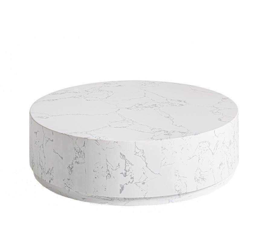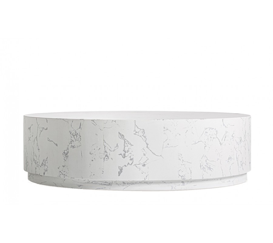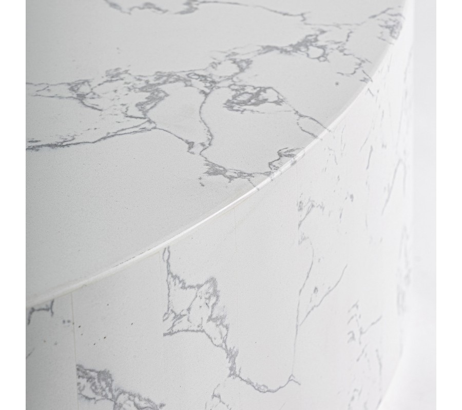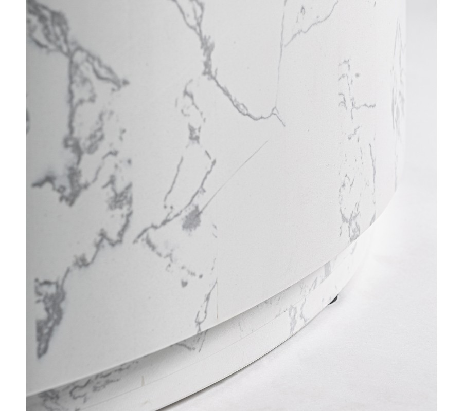 Stolík má modernú minimalistickú siluetu. Vrchná doska je okrúhla a nadväzuje na jednoduché valcovité telo stolíka. To je umiestnené na okrúhlej podstave s menším priemerom, takže vzniká štýlový plávajúci vizuál. Podstava je tiež v spodnej časti vybavená diskrétnymi klzákmi, ktoré chránia nábytok aj podlahu. Povrchy sú hladké a vyniká na nich elegantná kresba mramoru. Stolík má mohutný tvar, s váhou 59 kg, no vďaka čistej bielej farbe priestor vizuálne nezaťaží.