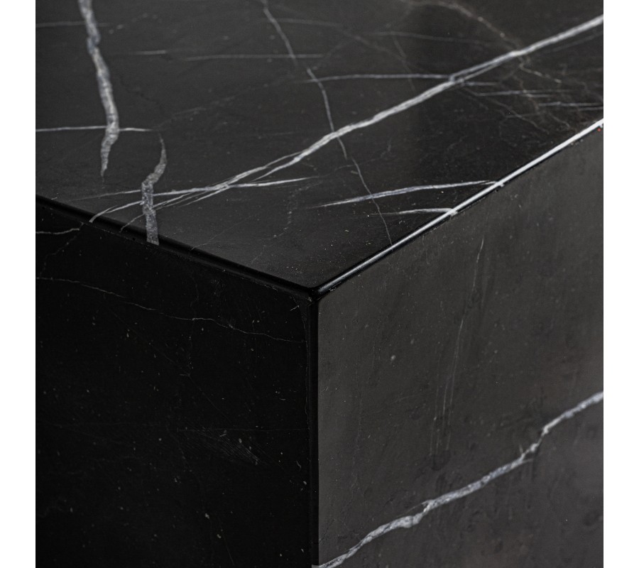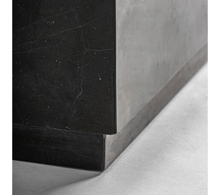 Rovné povrchy zdobí delikátna svetlá sivá mramorová kresba na hlbokom čiernom pozadí. Jej organický charakter vytvára kontrast k striktným líniám siluety a výborne korešponduje s minimalistickým konceptom. Okrem luxusného vizuálu oceníte aj výborné vlastnosti a vysokú odolnosť kompozitného mramoru. Je vodeodolný, nenáročný na údržbu a mimoriadne pevný. Nábytok vydrží krásny dlhé roky.