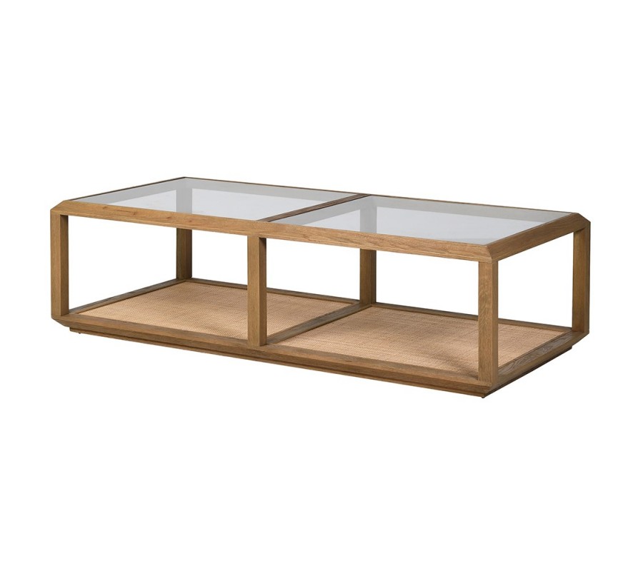 Konferenčný stolík Jery z masívneho dubu je navrhnutý v obdĺžnikovom tvare, ktorý pôsobí harmonicky a zároveň prakticky. Jeho konštrukciu tvorí pevný rám z drevených hranolov v teplom hnedo-dubovom odtieni, ktorý dodáva stolíku stabilitu a prírodný charakter. Vrchná časť pozostáva z dvoch samostatných priehľadných sklenených dosiek, oddelených dreveným predelom uprostred. Okolo dosiek sa nachádza rám so zošikmenými hranami, ktoré jemne zvýrazňujú línie stolíka.