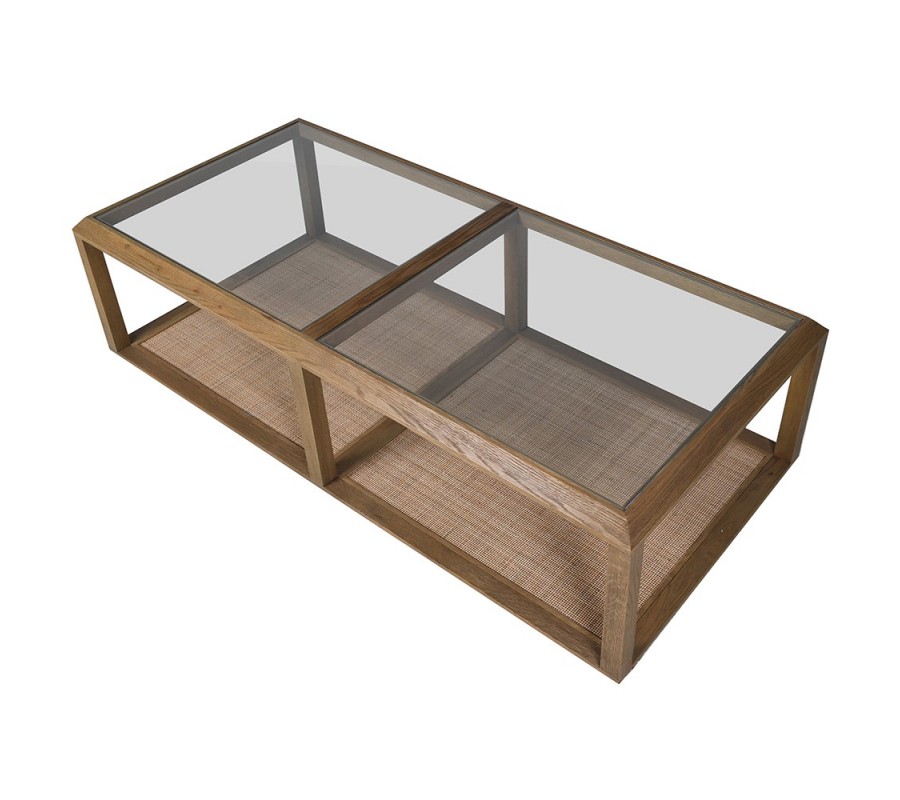 Spodnú časť tvorí praktická polica so zabudovaným výpletom vo viedenskom vzore, ktorá poskytuje dostatok miesta na odloženie kníh, časopisov či dekorácií. Vďaka prepojeniu šiestich nožičiek s policou vzniká pevná a kompaktná konštrukcia, ktorá zabezpečuje stabilitu a odolnosť stolíka. Kombinácia masívneho dubového dreva a skla pôsobí sviežo, vzdušne a zároveň zachováva robustný charakter etno štýlu.