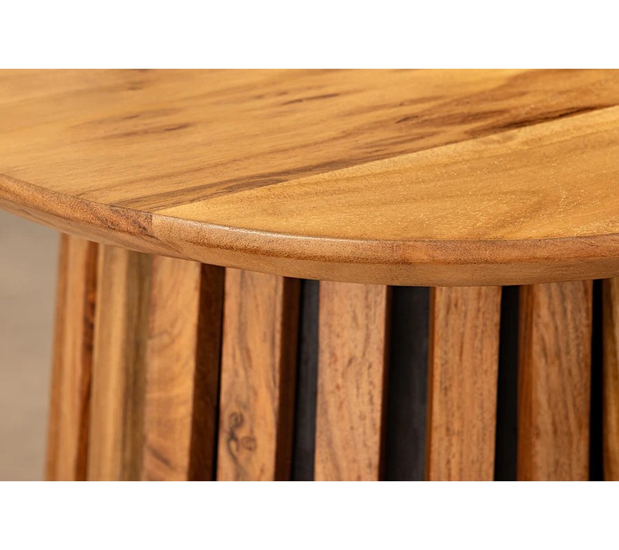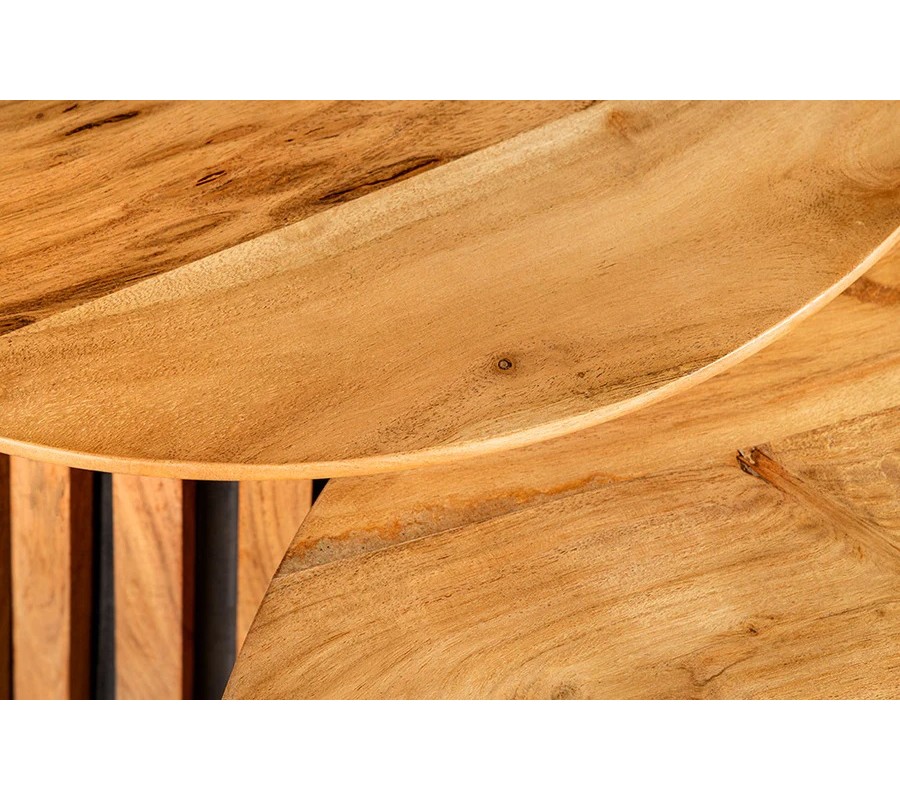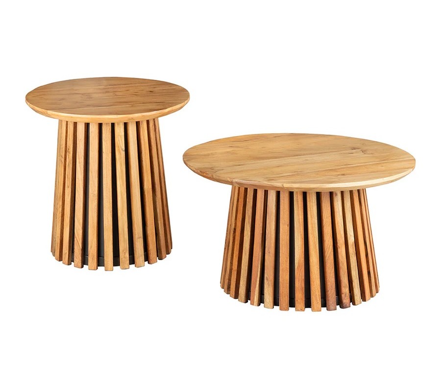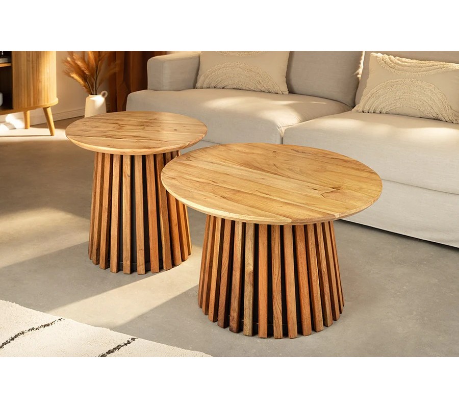 Sada konferenčných stolíkov Davidson z masívneho akáciového dreva vyniká výrazným prírodným vzhľadom a precíznou remeselnou prácou. Stolíky majú okrúhle lakované dosky s jemne zrezanými hranami, ktoré zdôrazňujú štruktúru dreva a jeho bohatú svetlohnedú farbu s prirodzenými odtieňmi a kresbou.