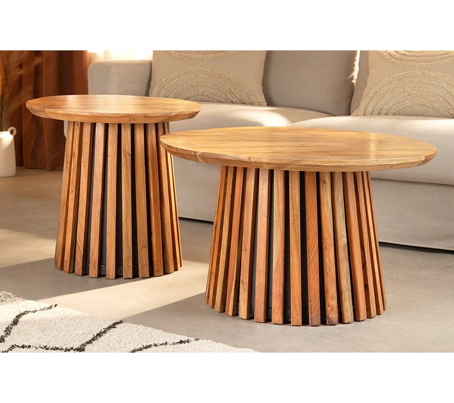 Masívní sada dvoch okrúhlych hnedých konferenčných stolíkov Davidson z akáciového dreva s lamelovou podstavou 70 cm