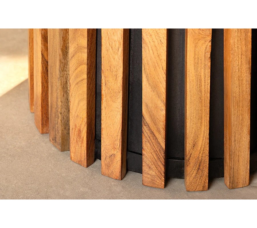 Zaujímavým prvkom je podstava v tvare zrezaného kužeľa, ktorá sa skladá z vertikálne usporiadaných drevených lamiel. Medzi lamelami presvitá tmavá čierna výstuž, ktorá dodáva stabilitu a zároveň kontrastne podčiarkuje prírodný charakter dreva.
