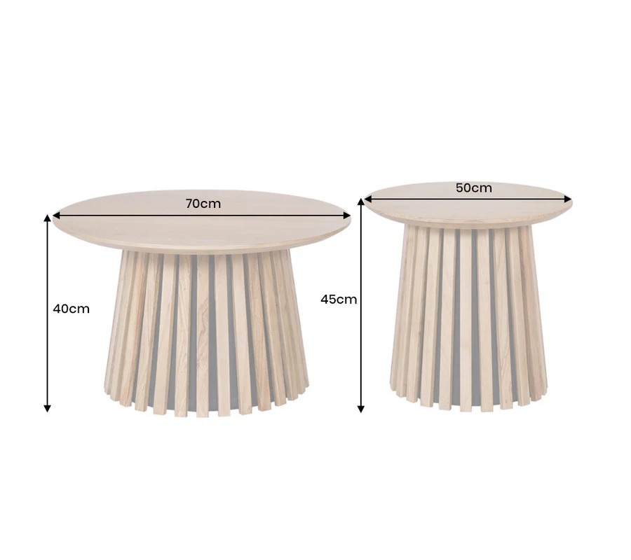 Väčší stolík má priemer 70 cm a výšku 40 cm, menší 50 cm a výšku 45 cm, vďaka čomu ich možno kombinovať spolu alebo umiestniť samostatne podľa potreby. Stolíky sú lakované, čo zvyšuje ich odolnosť voči každodennému používaniu.