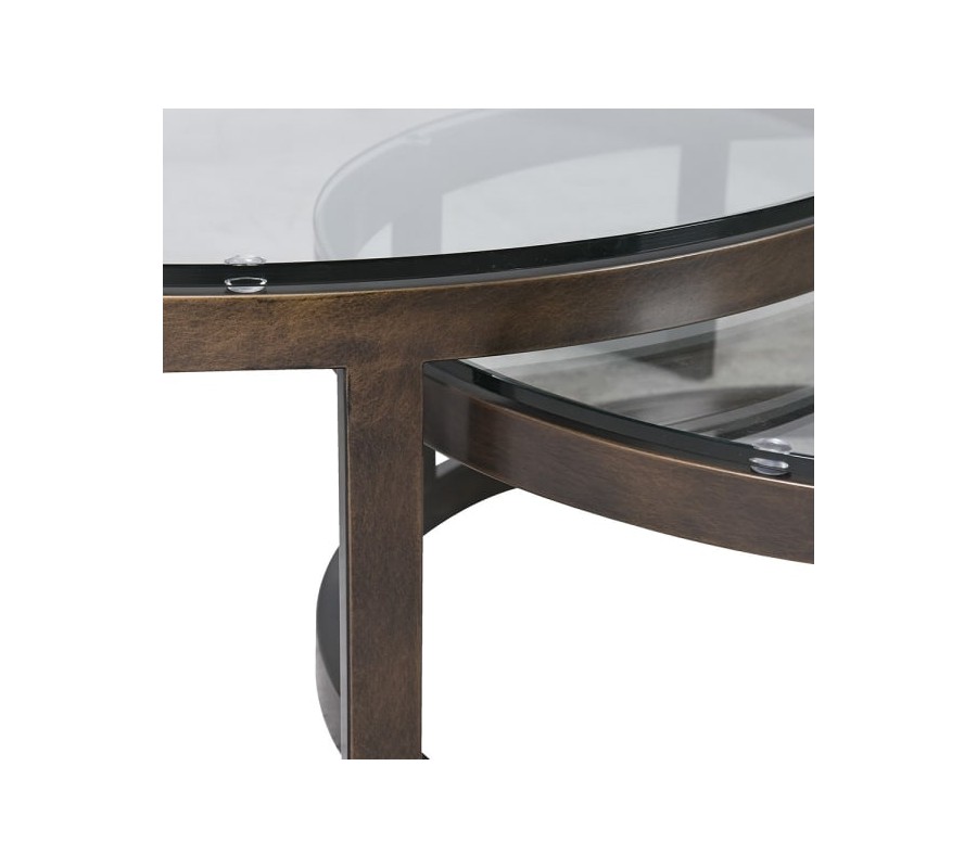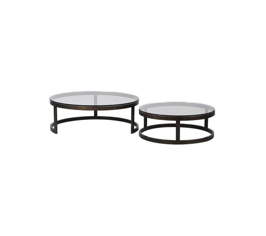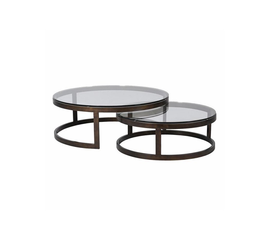 Industriálna okrúhla sada konferenčných stolíkov Riven je nadčasovým riešením do moderného interiéru. Skladá sa z väčšieho stolíka s výškou 36 cm a priemerom 100 cm a menšieho stolíka s výškou 30 cm a priemerom 80 cm. Oba majú pevné kovové konštrukcie v mosadznej farbe s jemnou patinou a vrchné priehľadné sklenené dosky, ktoré dodávajú priestoru ľahkosť.