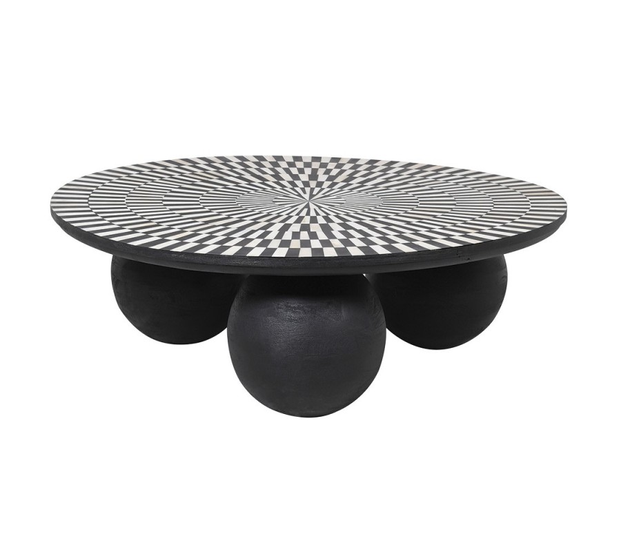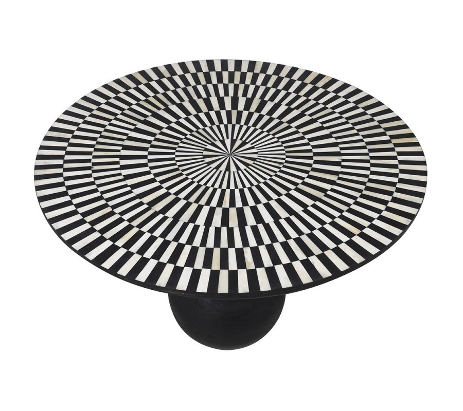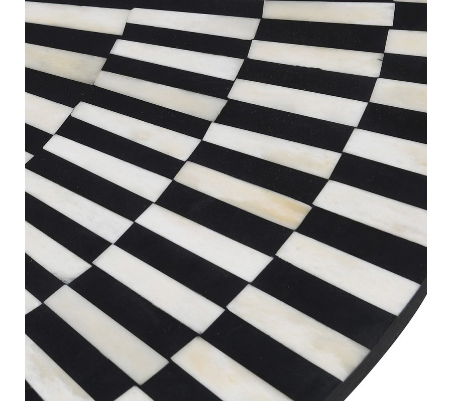 Luxusný art deco konferenčný stolík Siciliano je výnimočný dizajnový kúsok, ktorý spája umelecké remeslo a moderný optický efekt. Vyrobený je z mangového dreva v čiernom prevedení, pričom jeho vrchná doska je dekorovaná technikou bone inlay – vykladaním obrazcov z menších kúskov kostí. Precízny geometrický vzor v čiernej a bielej farbe vytvára optickú ilúziu točenia či pohybu a je usporiadaný do sústredných kruhov, ktoré zvýrazňujú dynamiku dizajnu.