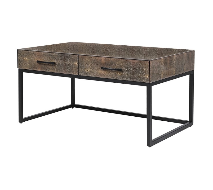 Konferenčný stolík Baron je elegantný industriálny kúsok s výrazným charakterom, ktorý spája luxusnú textúru kože so studenou estetikou kovu. Jeho obdĺžniková doska je potiahnutá hnedou koženkou s reliéfnym povrchom typu shagreen, ktorý verne imituje jemnú zrnitú štruktúru raje. V závislosti od dopadu svetla sa odtiene materiálu menia od medovej až po bronzovo hnedú, čo dodáva povrchu hĺbku a elegantný lesk.