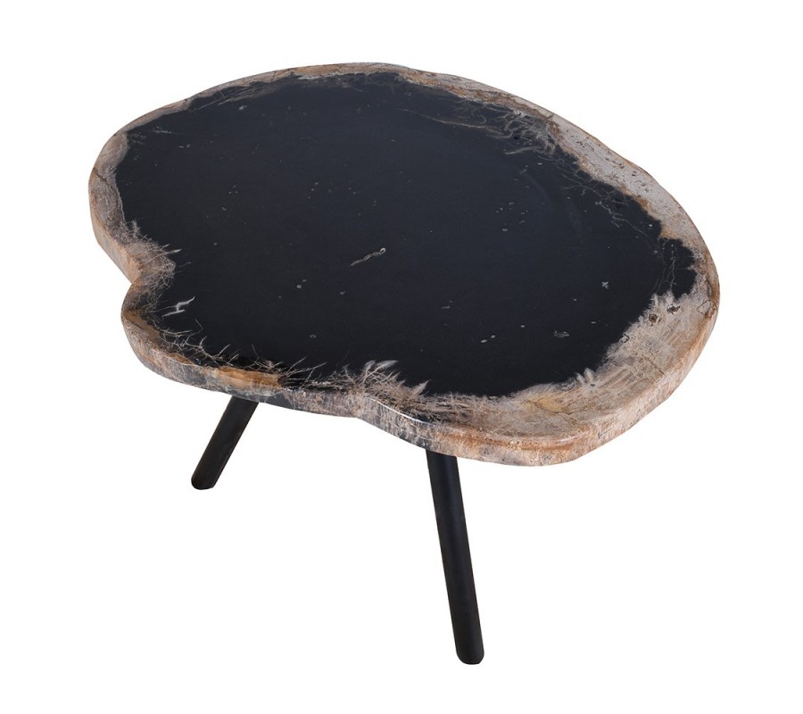 Luxusný industriálny asymetrický konferenčný stolík Helup zo skameneného dreva s kovovou čiernou konštrukciou 63 cm