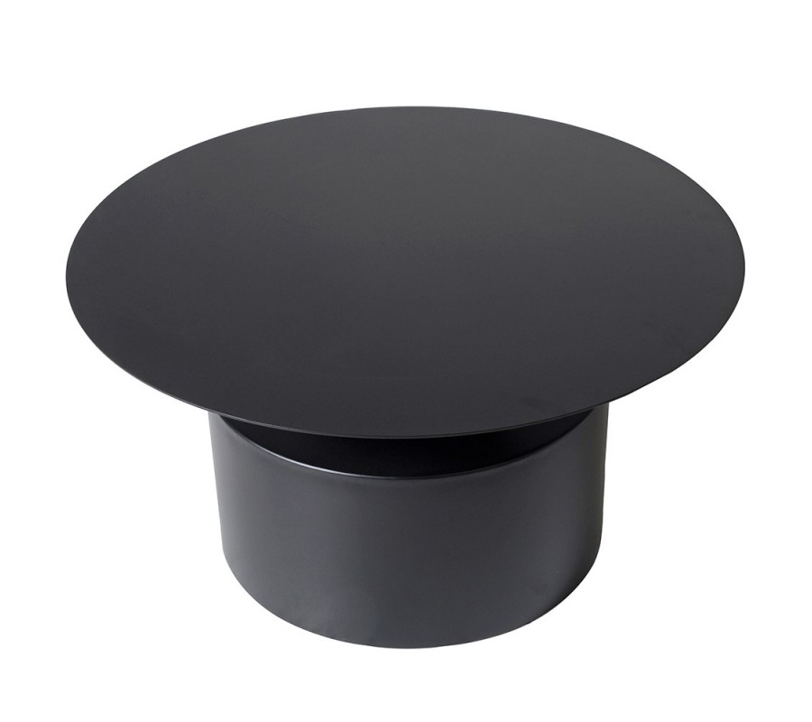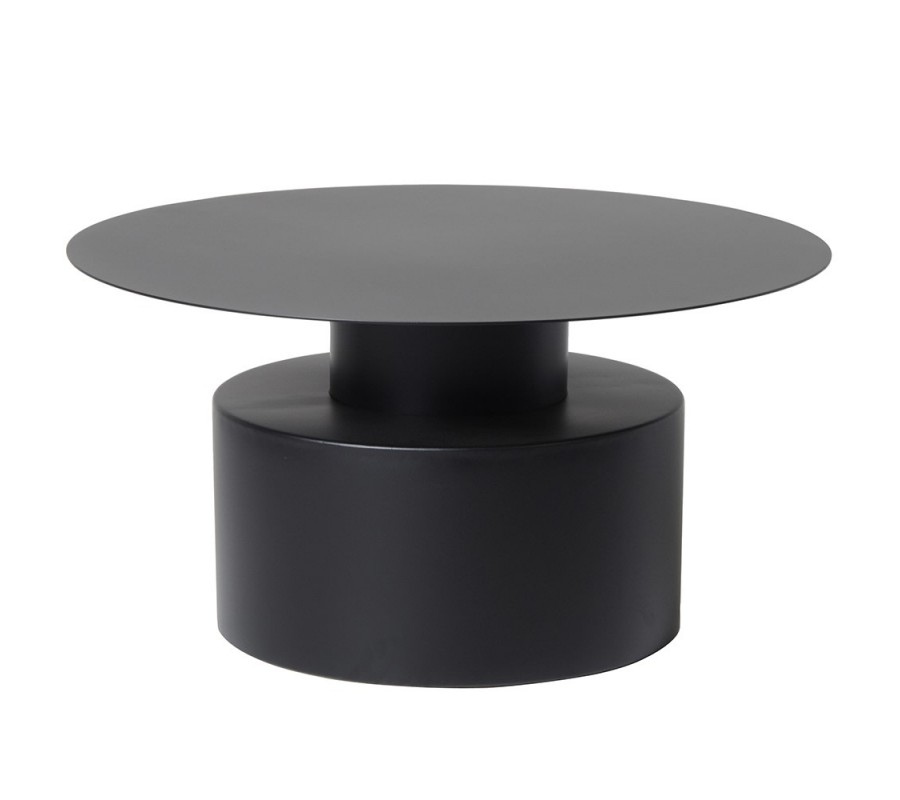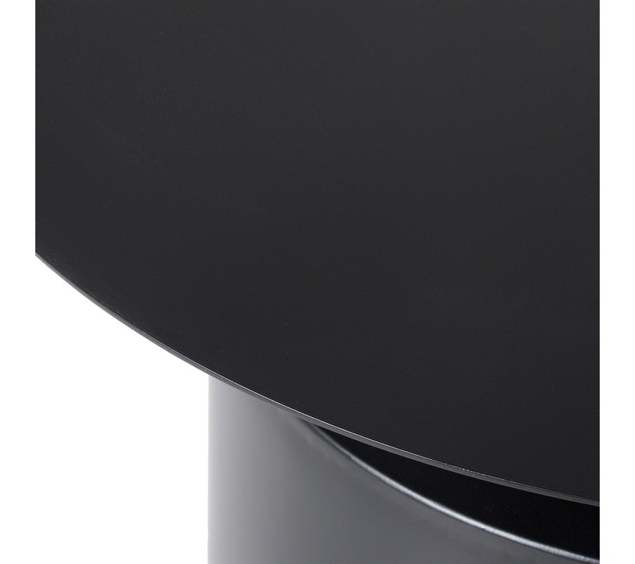 Stolík je vyrobený z kovu v matnom čiernom prevedení. Jeho hladký povrch je pevný a zároveň nenáročný na údržbu. Vrchná doska má okrúhly tvar a jej mimoriadne štíhla hrana vytvára zaujímavý vizuálny kontrast k mohutnej podstave. Je položená na užšom valcovitom hrdle, ktoré sa následne vo vodorovnej línii prudko rozširuje do veľkej valcovitej nohy, zaručujúcej nábytku výbornú stabilitu. Línie podstavy sú jemne zaoblené, no stále geometrické, čo podčiarkuje moderný vizuál.