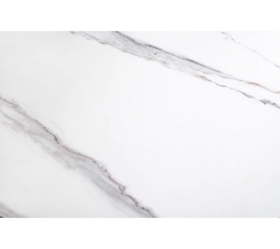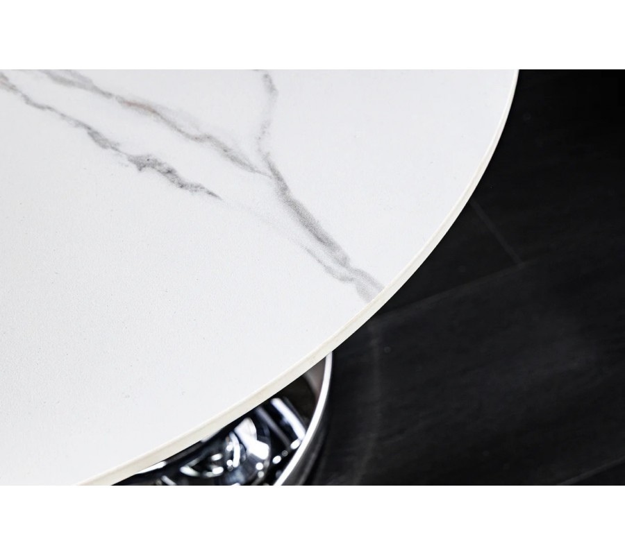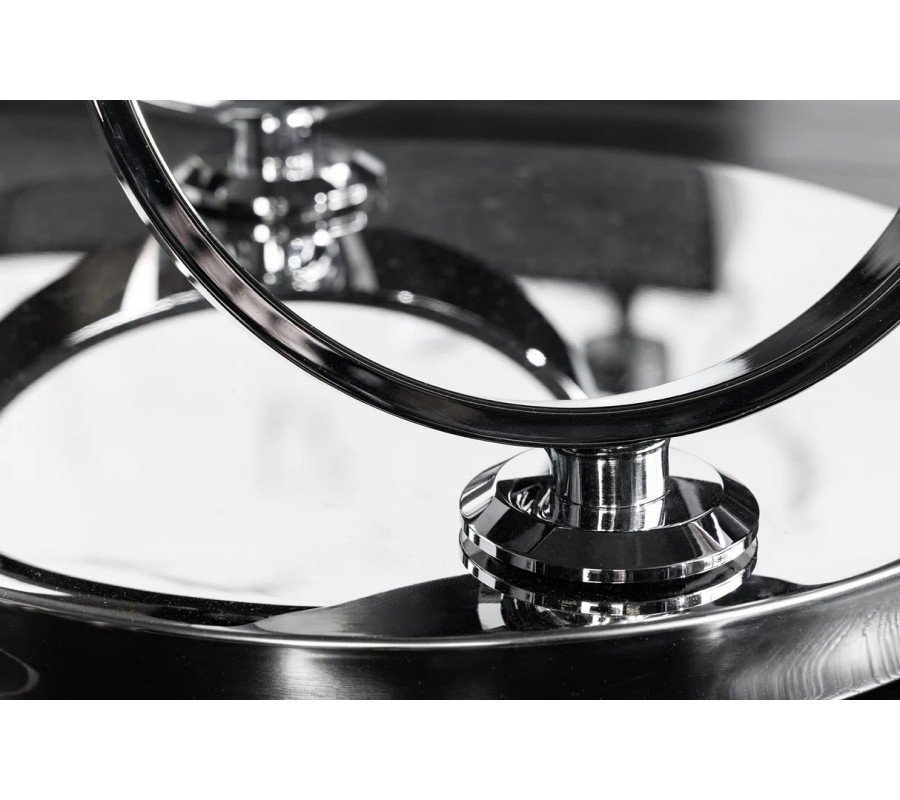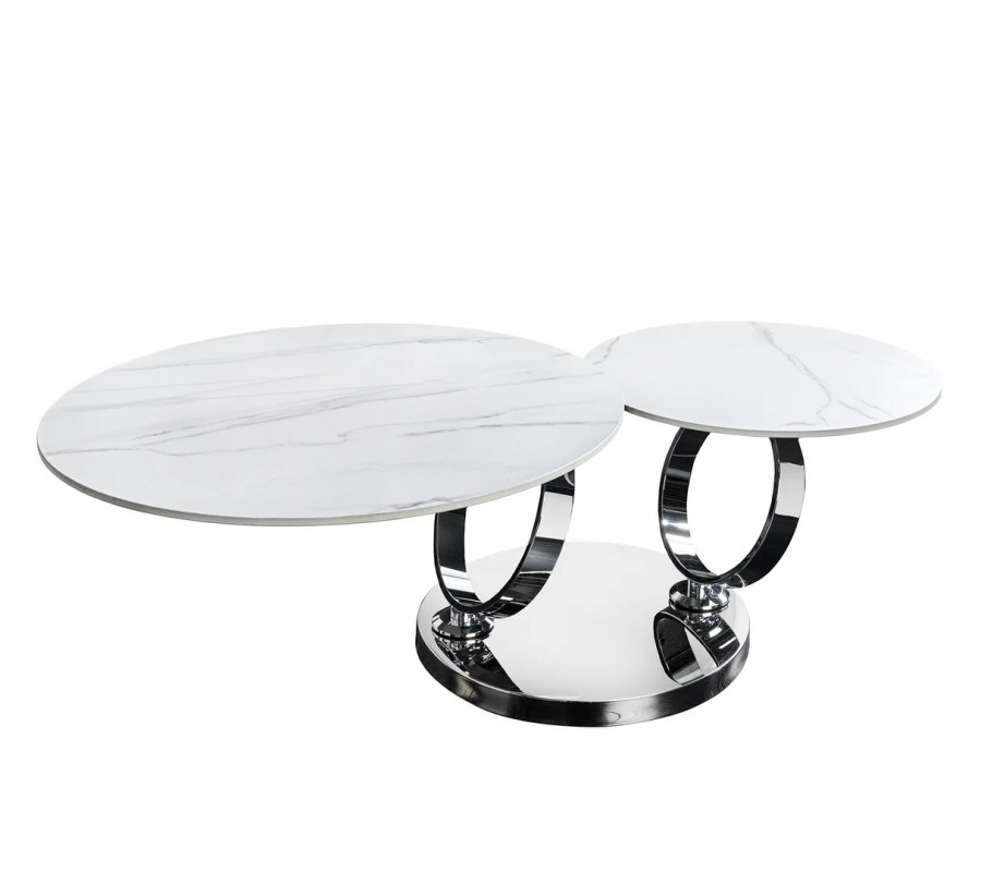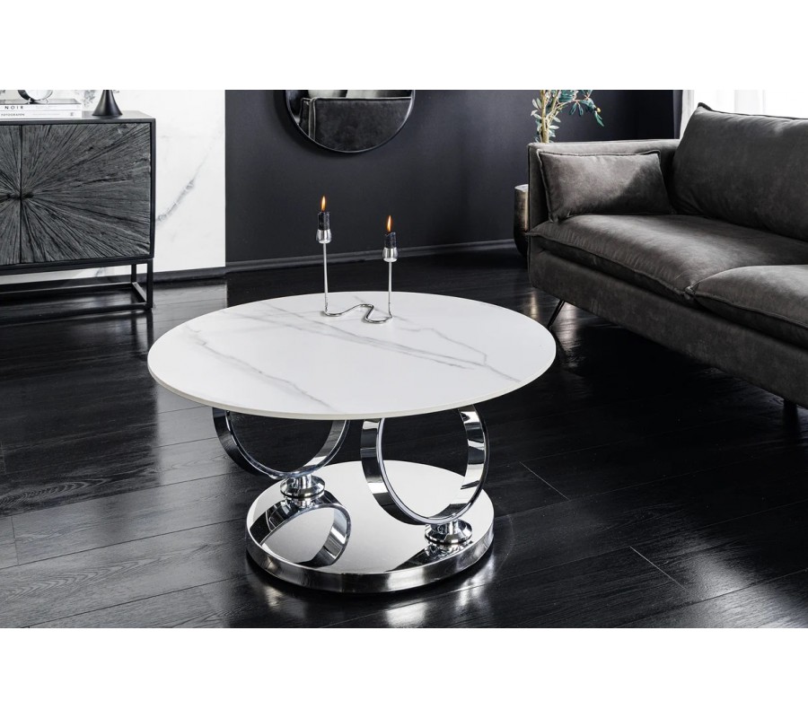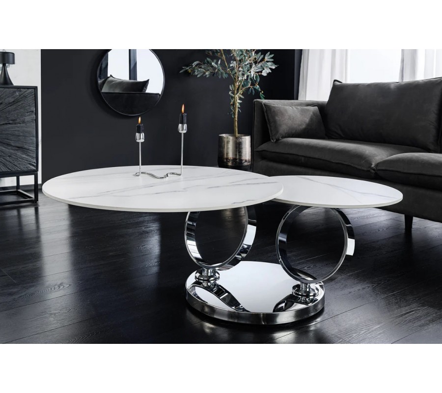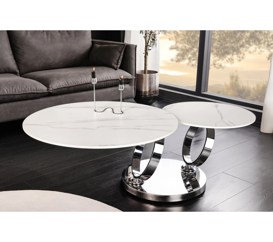 Stolík je postavený na okrúhlej chrómovanej kovovej podstave, z ktorej vyrastajú dva elegantné kovové kruhy, slúžiace ako nosná konštrukcia pre vrchné dosky. Na nich sú umiestnené dve okrúhle keramické dosky s mramorovým dizajnom v bielej farbe so sivými žilkami, ktoré pôsobia mimoriadne luxusne a zároveň vzdušne. Väčšia doska má priemer 80 cm, menšia 55 cm.