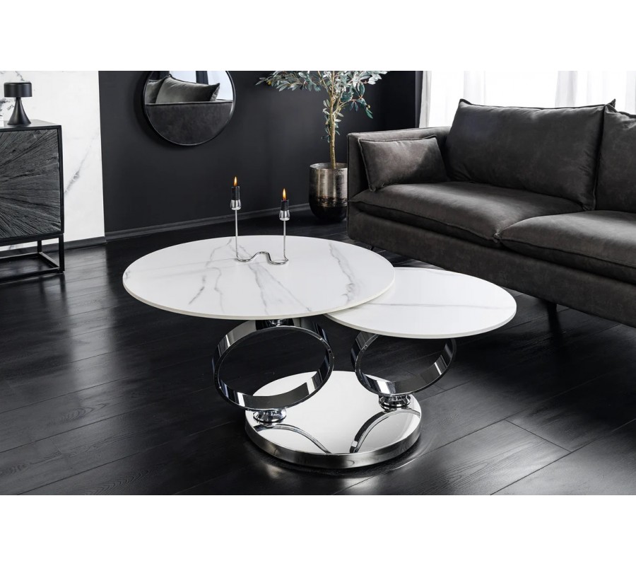 Glamour mramorový biely konferenčný stolík Delin s dvomi otočnými okrúhlymi doskami a chrómovanou podstavou 80-133 cm