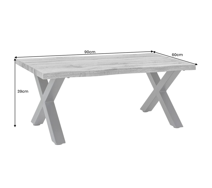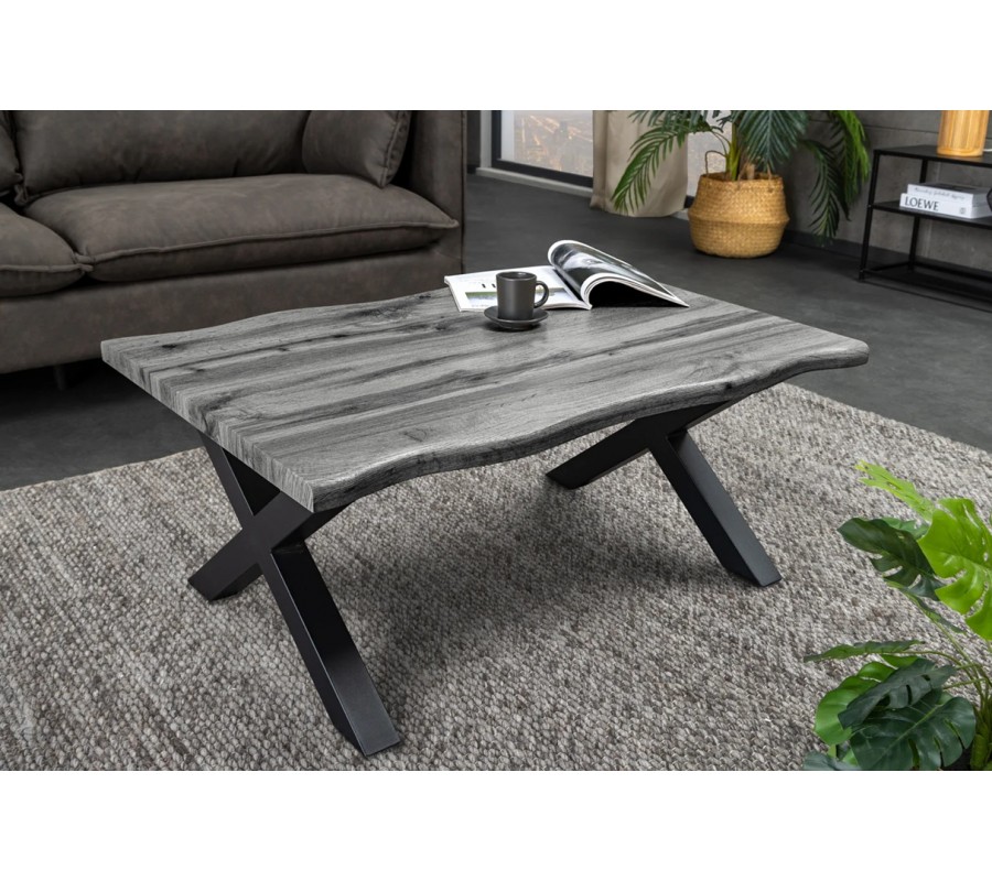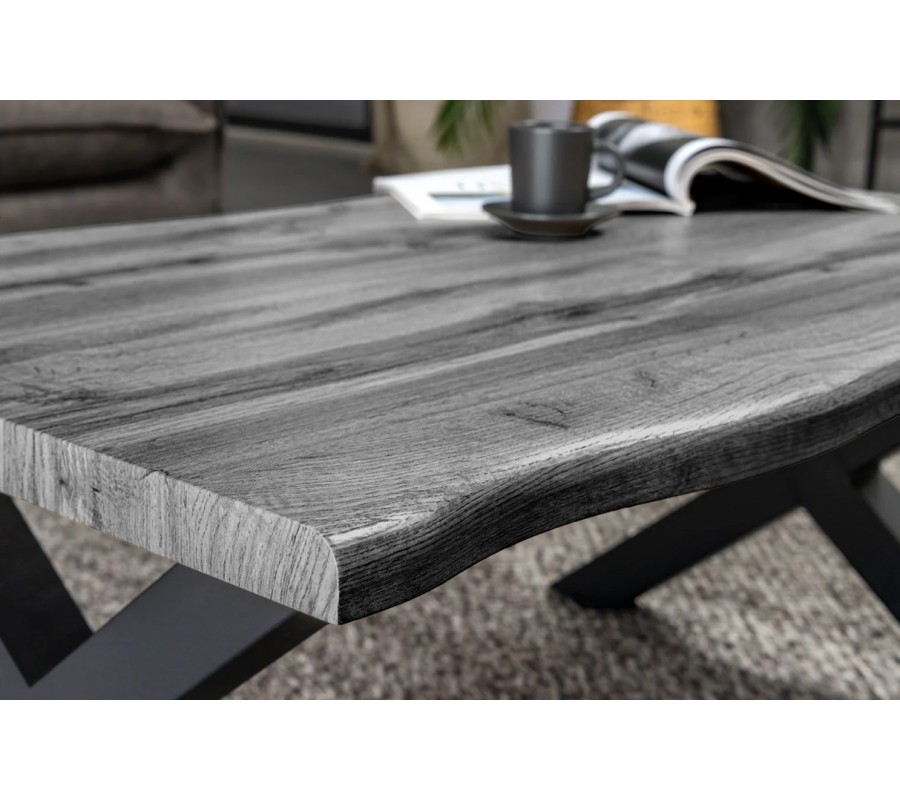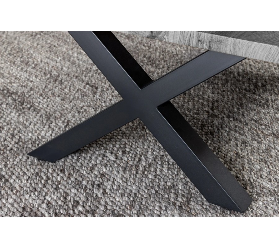 Vrchná doska je tvorená dýhovaným drevom so sivým odtieňom a viditeľnou prirodzenou kresbou, pričom jemne lesklá povrchová úprava zvýrazňuje kresbu materiálu a zároveň poskytuje ochranu pred opotrebovaním. Stolík stojí na štyroch kovových nohách v čiernej farbe s matným povrchom, usporiadaných do dvoch prekrížených párov, ktoré svojim tvarom pripomínajú robustné písmeno X. Kov v matnej čiernej farbe prináša do dizajnu moderný priemyselný prvok, pričom tento materiál zabezpečuje maximálnu stabilitu a pevnosť celej konštrukcie.