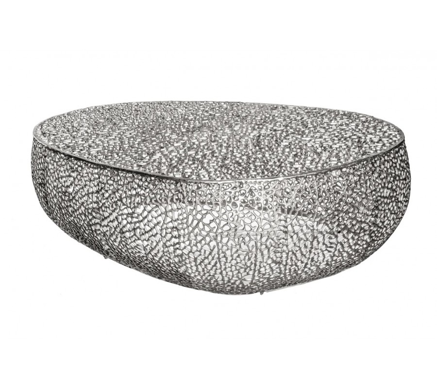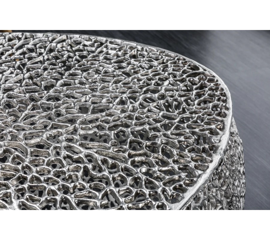 Stolík je ručne vyrobený z kovovej zliatiny, čo dodáva každému kusu originálny charakter. Materiál je pevný a stolík má tak výbornú stabilitu a vzdušný vizuál. Strieborná farba pôsobí vďaka jemne matnému prevedeniu elegantne a luxusne zároveň.